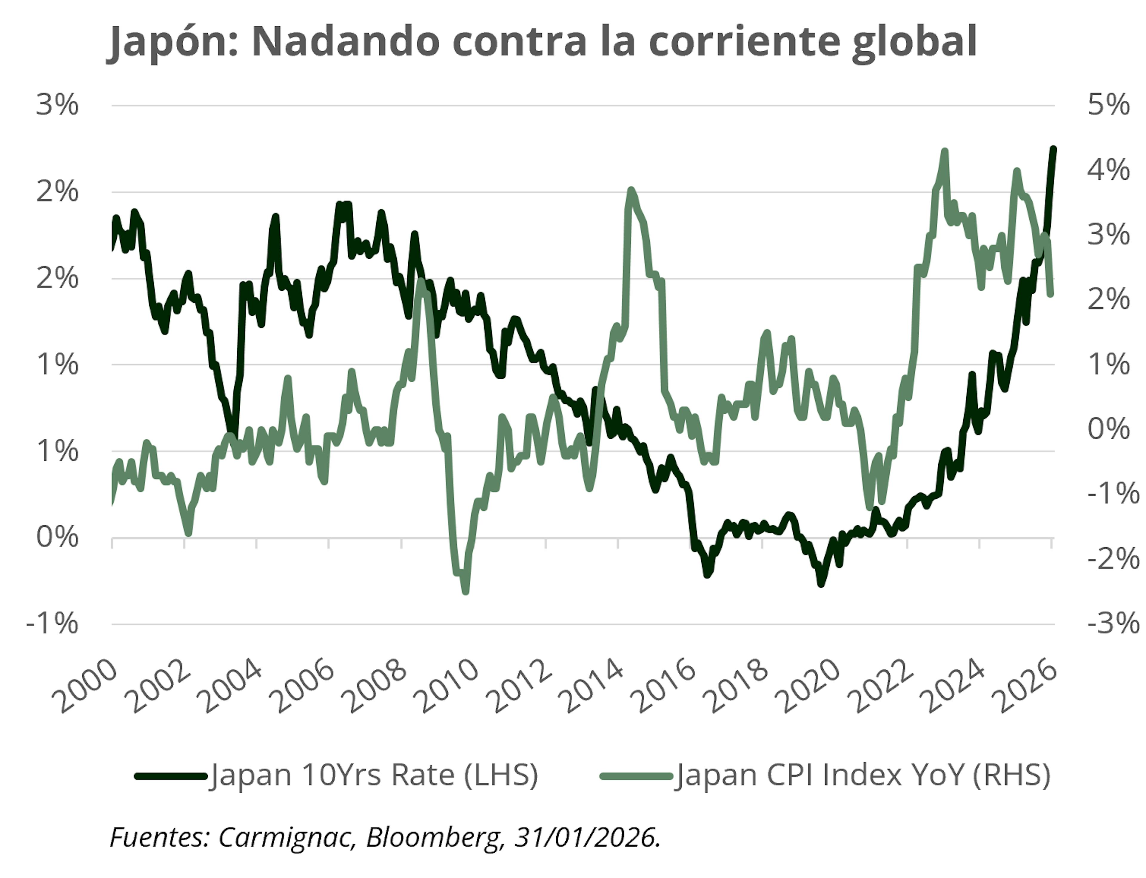 Para los mercados de obligaciones, las implicaciones son significativas. La carga de la deuda en sí misma no es nueva, pero el entorno en el que se financia ha cambiado. Las expectativas de inflación ya no están ancladas en cero y, aunque las presiones generales se moderen, la mayor volatilidad aboga por una reconstrucción de la prima de plazo. A medida que el Banco de Japón se retira gradualmente y los inversores privados absorben más emisiones, la compensación por la duración y el riesgo de inflación debería aumentar. La normalización es cautelosa, pero deliberada: el control de la curva de tipos se ha diluido y los tipos de interés oficiales han pasado a ser positivos.