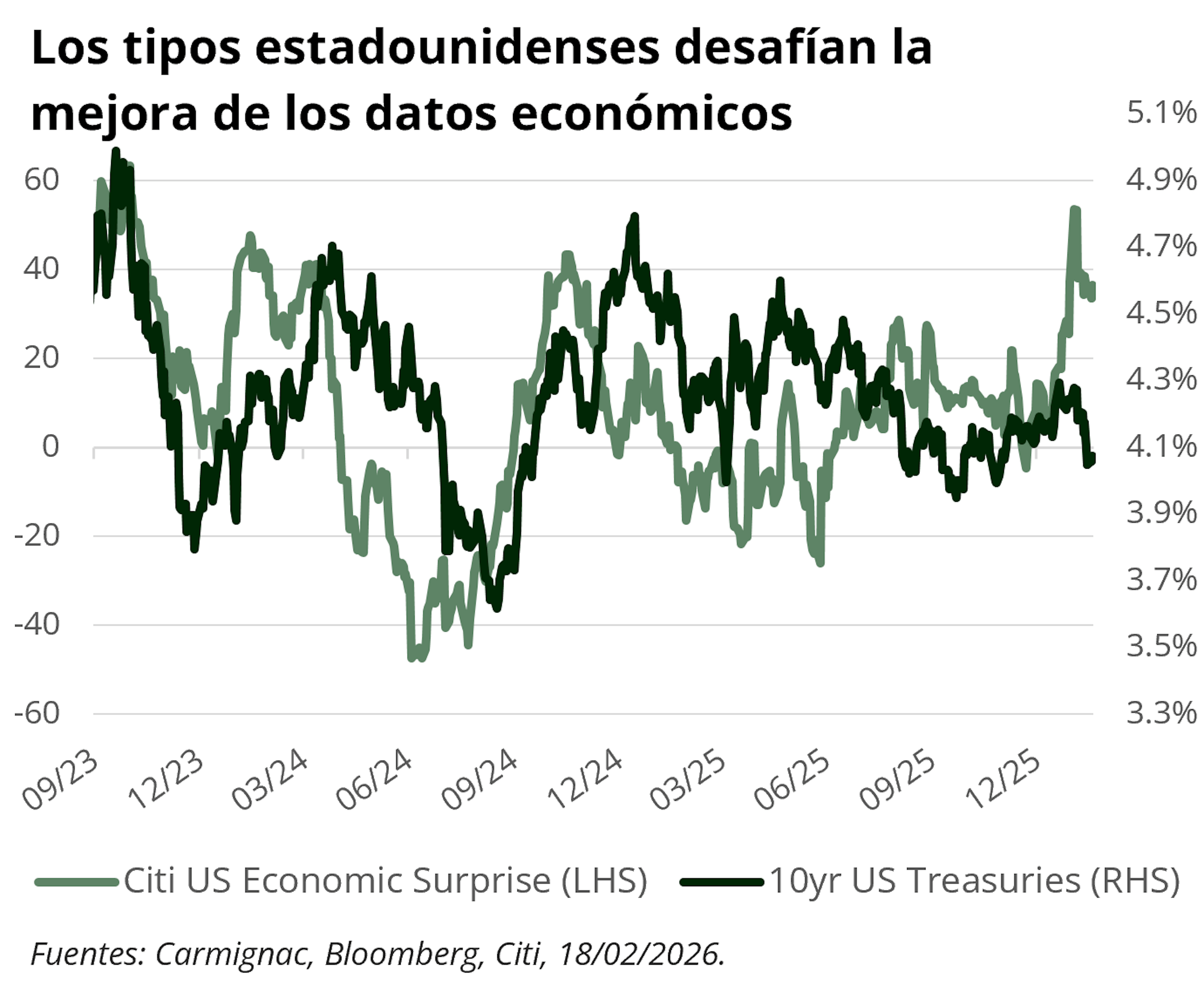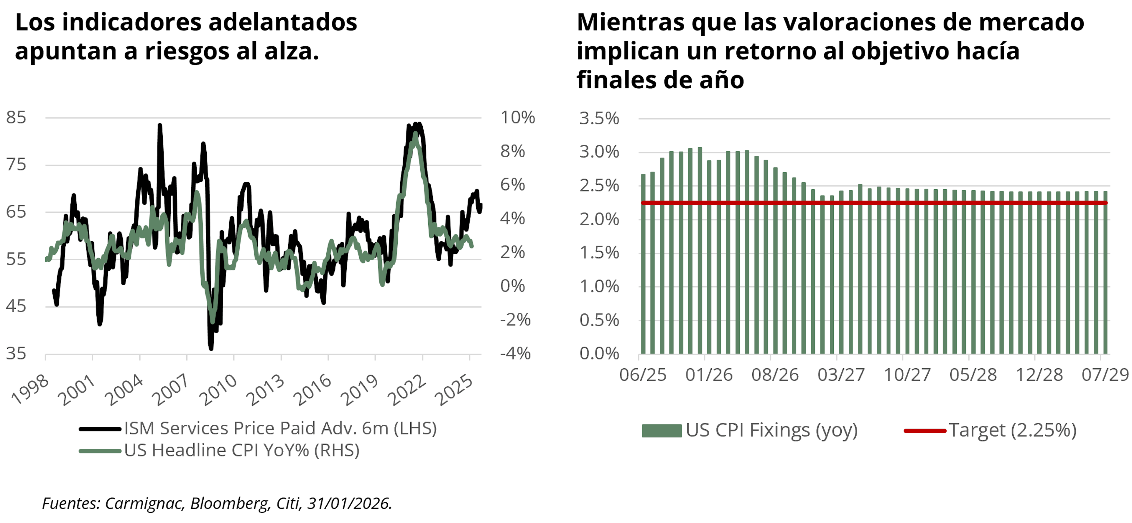 La inflación sigue siendo persistente en los componentes básicos y por encima del objetivo de la FED. Se prevé que el PCE subyacente se mantenga muy por encima del 2% en 2026, con riesgos sesgados al alza. En este contexto, los mercados están descontando aproximadamente 50 puntos básicos de recortes de tipos en 2026, una hipótesis que podría resultar optimista si el crecimiento se mantiene cercano a la tendencia y la política fiscal sigue siendo favorable.