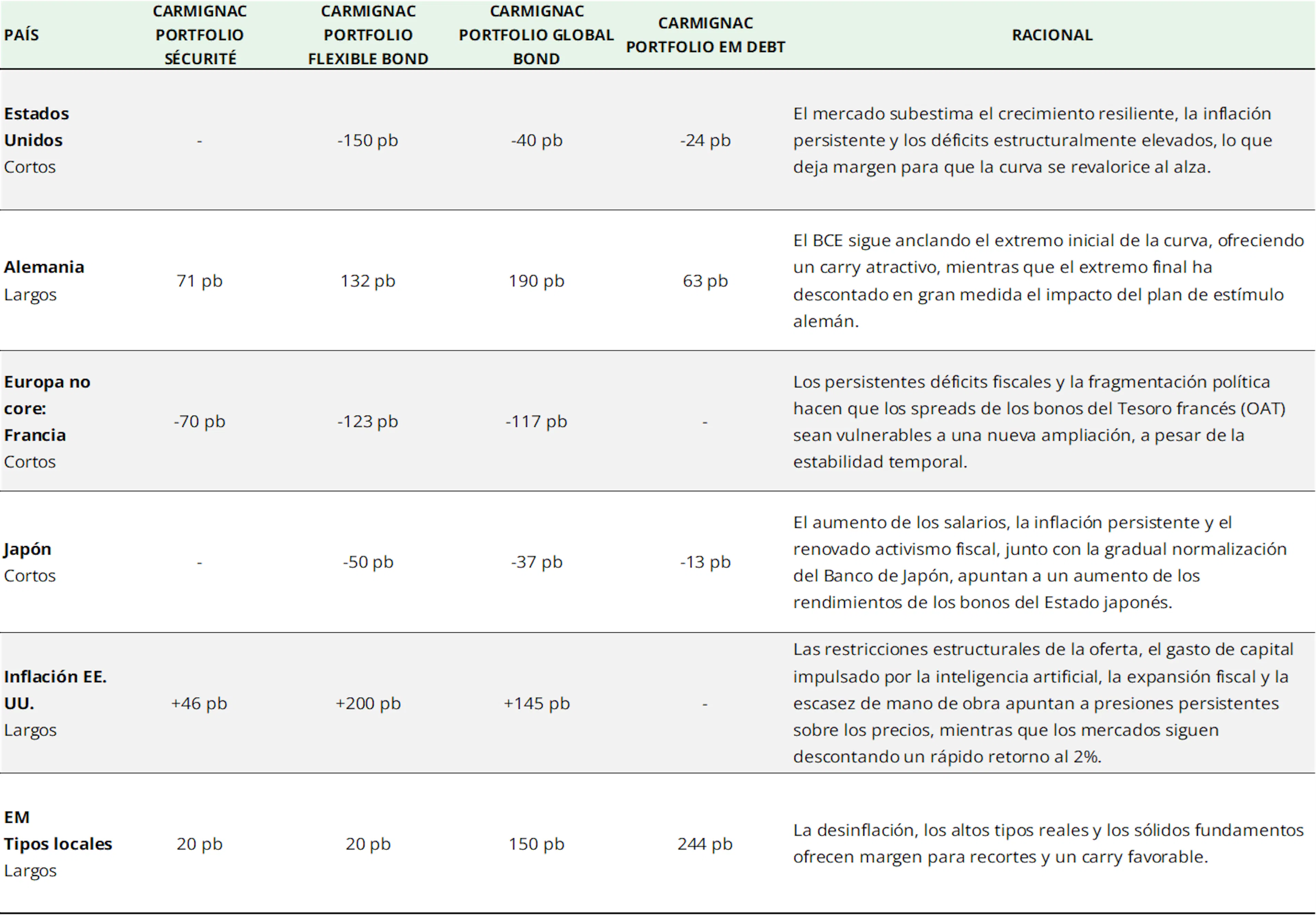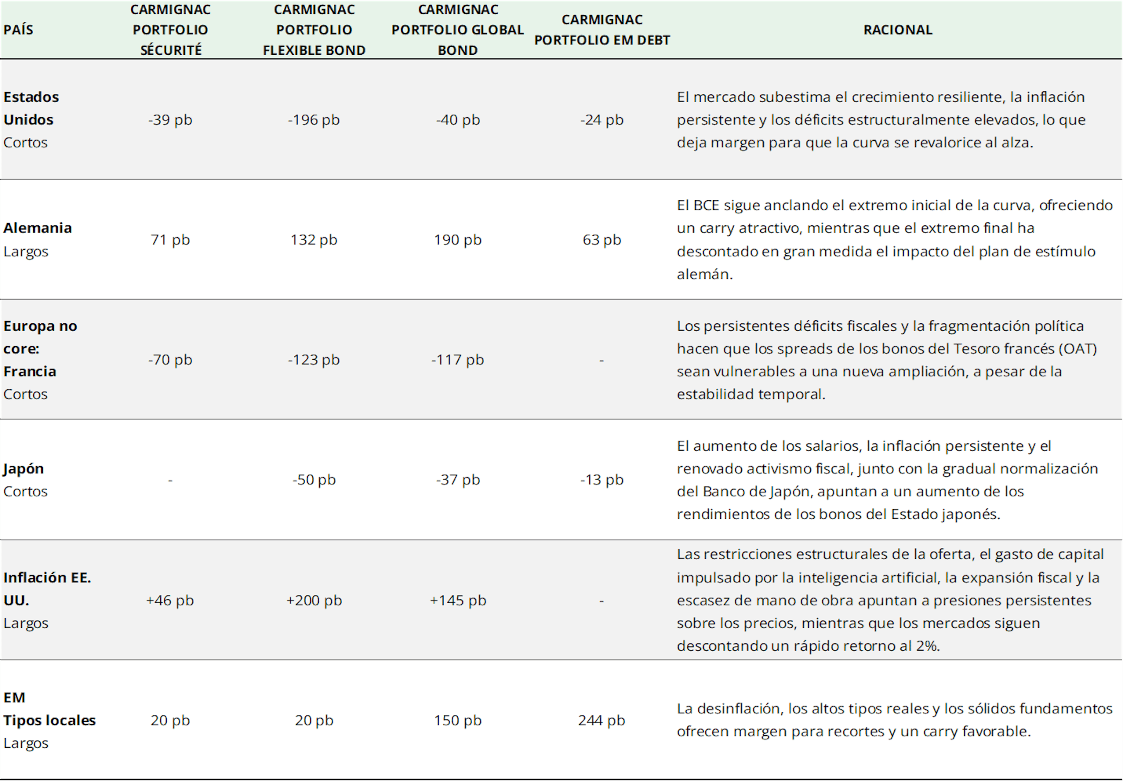 En este contexto, optamos por una exposición diferenciada en cuanto a la duración: cortos en EE. UU. y Japón, largos en Alemania, cautelosos en Europa no core y constructivos en determinados mercados emergentes.