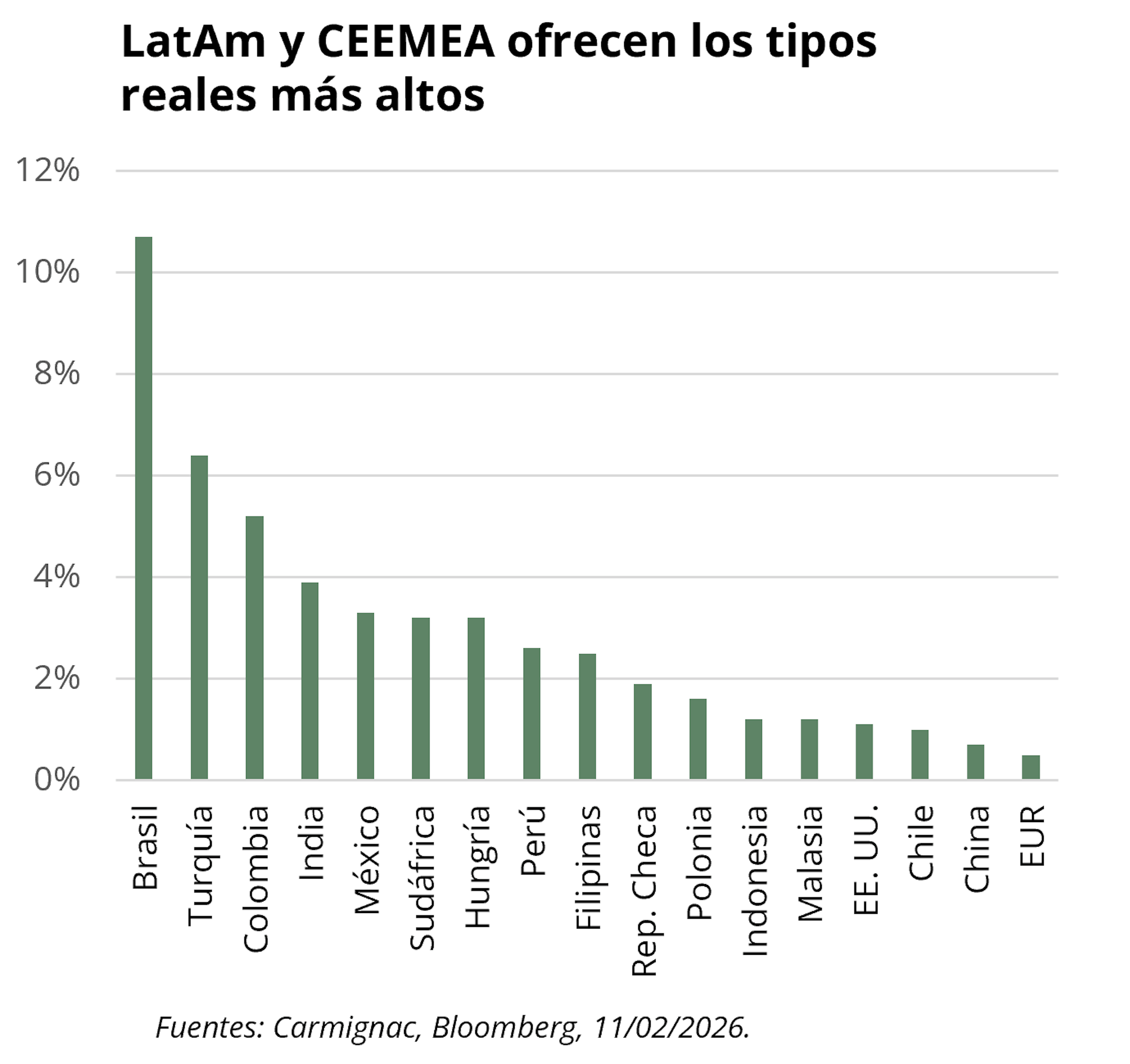 Sin embargo, ese contexto constructivo no se aplica de manera uniforme en todo el universo. La selectividad es esencial. Nos estamos centrando en países donde las políticas restrictivas, la mejora de los fundamentos económicos y la credibilidad de los bancos centrales crean un claro margen para la bajada de los tipos de interés.