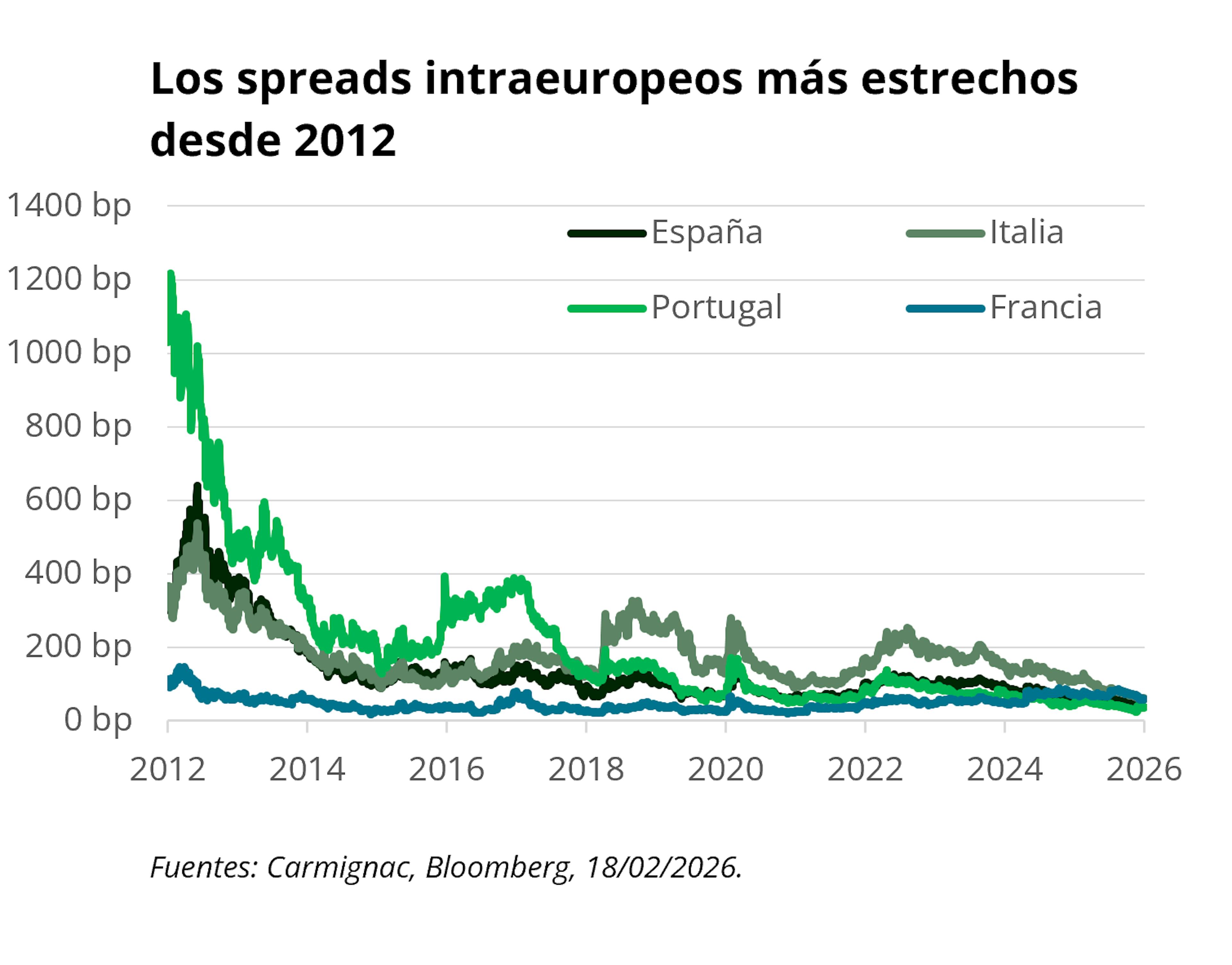 Mientras que Alemania se erige como el pilar fiscal de la recuperación de la zona euro, el panorama es más matizado en otros lugares. Los factores que sustentan la estabilidad alemana —instituciones creíbles, fuerte capacidad fiscal y estatus de refugio seguro— no tienen una participación uniforme en toda la periferia. Los spreads siguen siendo históricamente ajustados, lo que refleja un mercado impulsado por el carry y la búsqueda de rentabilidad. Sin embargo, este entorno corre el riesgo de ocultar las vulnerabilidades fiscales y políticas subyacentes en determinados países, entre los que destaca Francia como ejemplo notable.