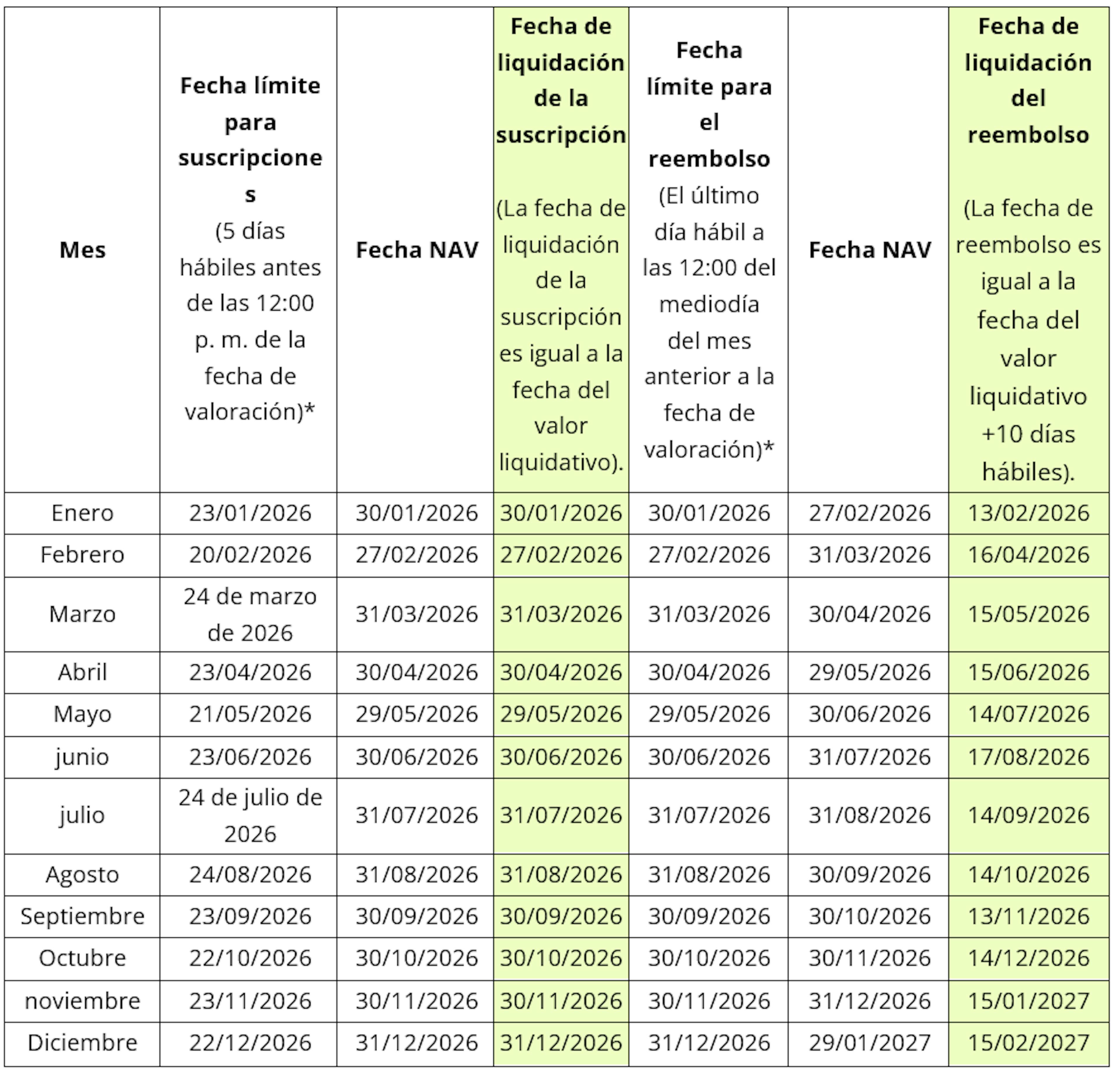 El valor liquidativo (NAV) se calcula y publica de acuerdo con la descripción que figura en el folleto y en el suplemento correspondiente en las fechas en que pueden emitirse o reembolsarse las participaciones y participaciónes. La fecha límite para las suscripciones es 5 días hábiles antes de la fecha de cálculo del valor liquidativo y la fecha límite para los reembolsos es 30 días hábiles antes de la fecha de cálculo del valor liquidativo. El folleto también establece que siempre debe publicarse un valor liquidativo a 31 de diciembre, incluso si el 31 de diciembre no es un día hábil ni bursátil.