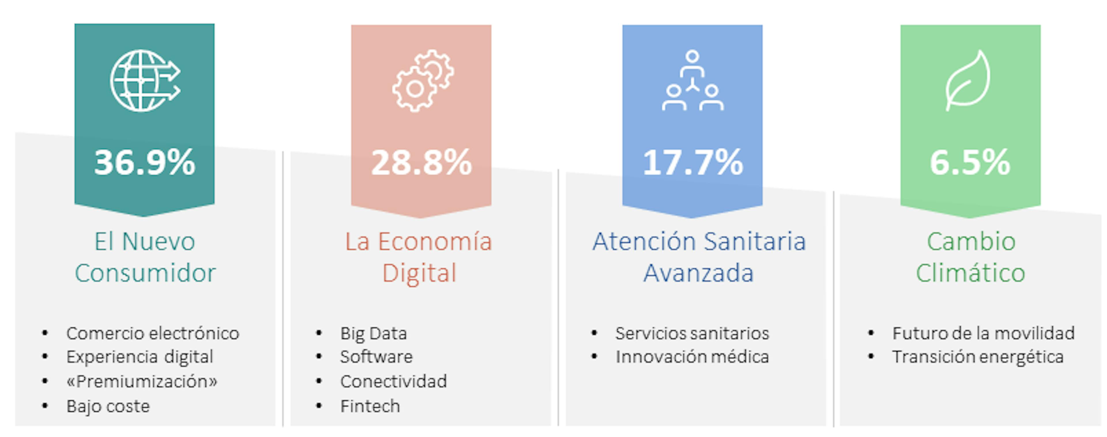 En general, mantenemos una cartera de inversión líquida y sólida basada en firmes convicciones, así como diversificada en términos geográficos, sectoriales y temáticos. Nuestras temáticas principales giran en torno a: