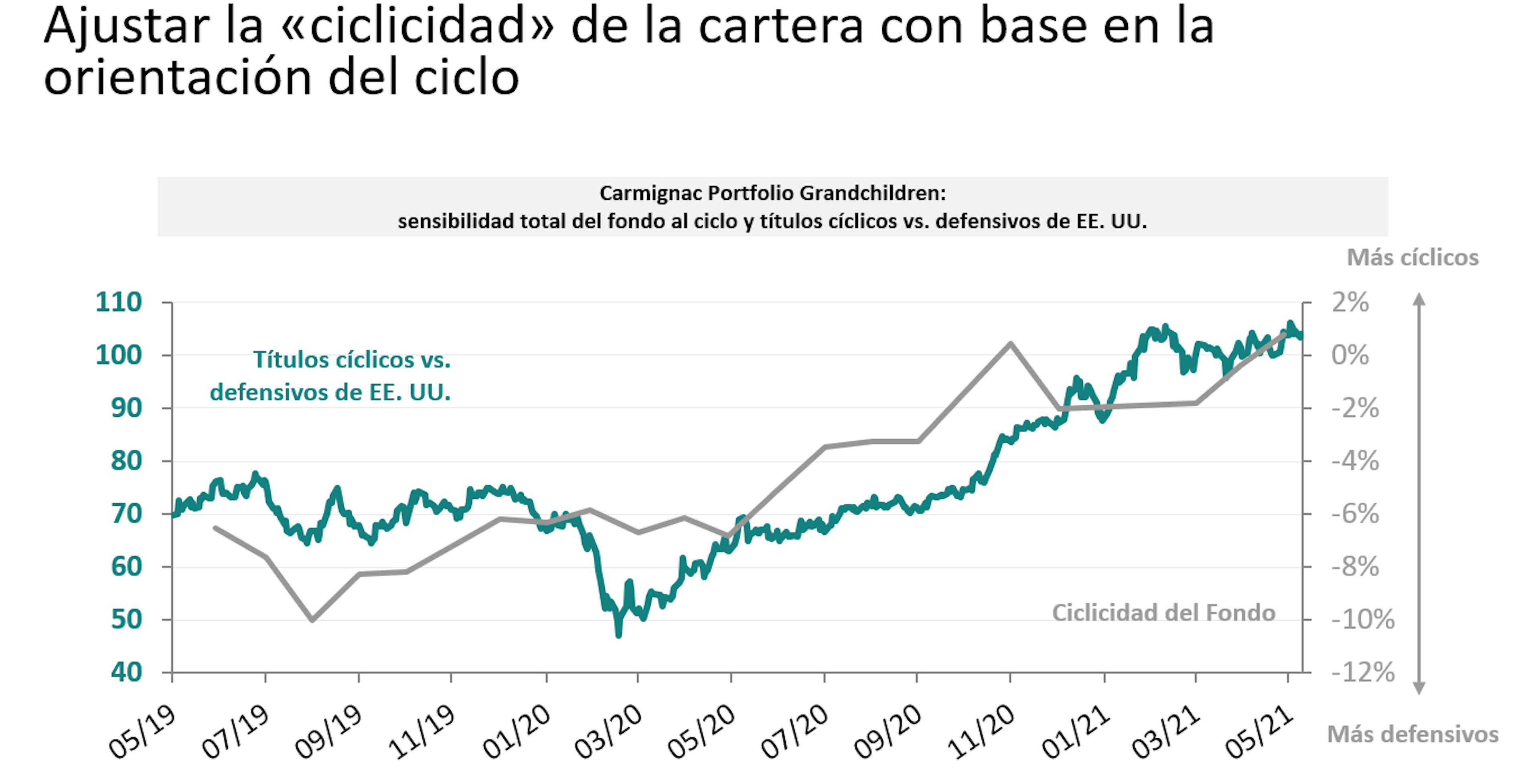 Hasta mayo de 2020, nuestra cartera estaba sesgada principalmente hacia empresas de calidad más defensivas, en un contexto de ralentización del crecimiento en todo el mundo. Cuando las expectativas de crecimiento de los beneficios alcanzaron su punto mínimo a mediados del año pasado, decidimos incrementar gradualmente la ponderación de nuestros títulos más cíclicos y, en cierto modo, remodelamos nuestra cartera. Este reequilibrio cíclico nos permitió mitigar las repercusiones de la rotación sectorial que estaba teniendo lugar desde finales de 2020. Tal y como se muestra en el gráfico, el ajuste de las ponderaciones de las posiciones con base en nuestra perspectiva sobre el ciclo se sitúa en el epicentro de nuestra estrategia.