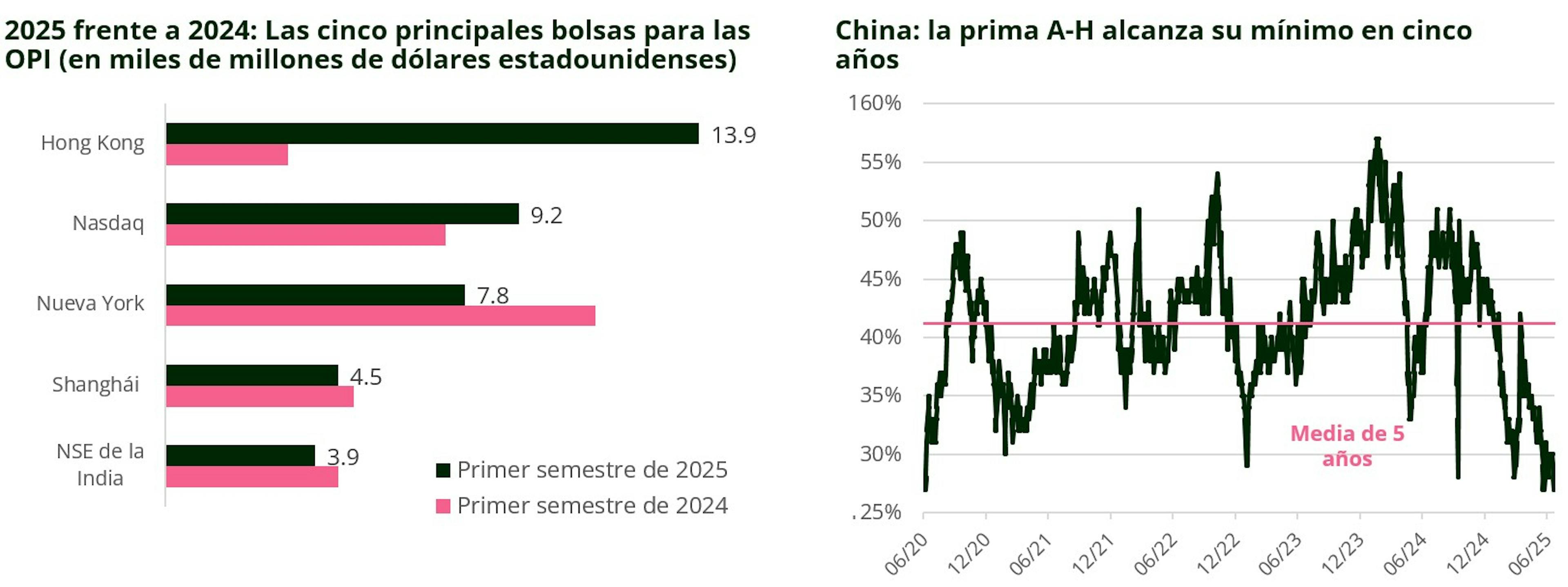 Factores como la relajación de las tensiones comerciales, el momento «DeepSeek» de China y las valoraciones de mercado aún atractivas en términos relativos han impulsado los flujos. Nos alienta que el capital extranjero esté dispuesto a pagar una prima por las acciones H de empresas chinas únicas, de calidad y con valor de escasez, aunque siempre mantendremos nuestra prudencia en la valoración. Parte de la reciente oleada de salidas a bolsa en Hong Kong se debe al renovado temor a la exclusión de las ADR estadounidenses de las empresas chinas. Esta manifestación de las tensiones entre Estados Unidos y China en los mercados es una presencia constante que se acentúa con las oleadas de proteccionismo. Es algo que ya hemos visto antes y no creemos que esta última presión, aparentemente desencadenada por el comentario del secretario del Tesoro estadounidense, Bessent, de que «todo está sobre la mesa», tenga un resultado catastrófico para los ADR chinos, pero reconocemos que, mientras persista la amenaza, habrá una presión innecesaria sobre las empresas chinas que cotizan en EE. UU. y no tienen doble cotización en su país.