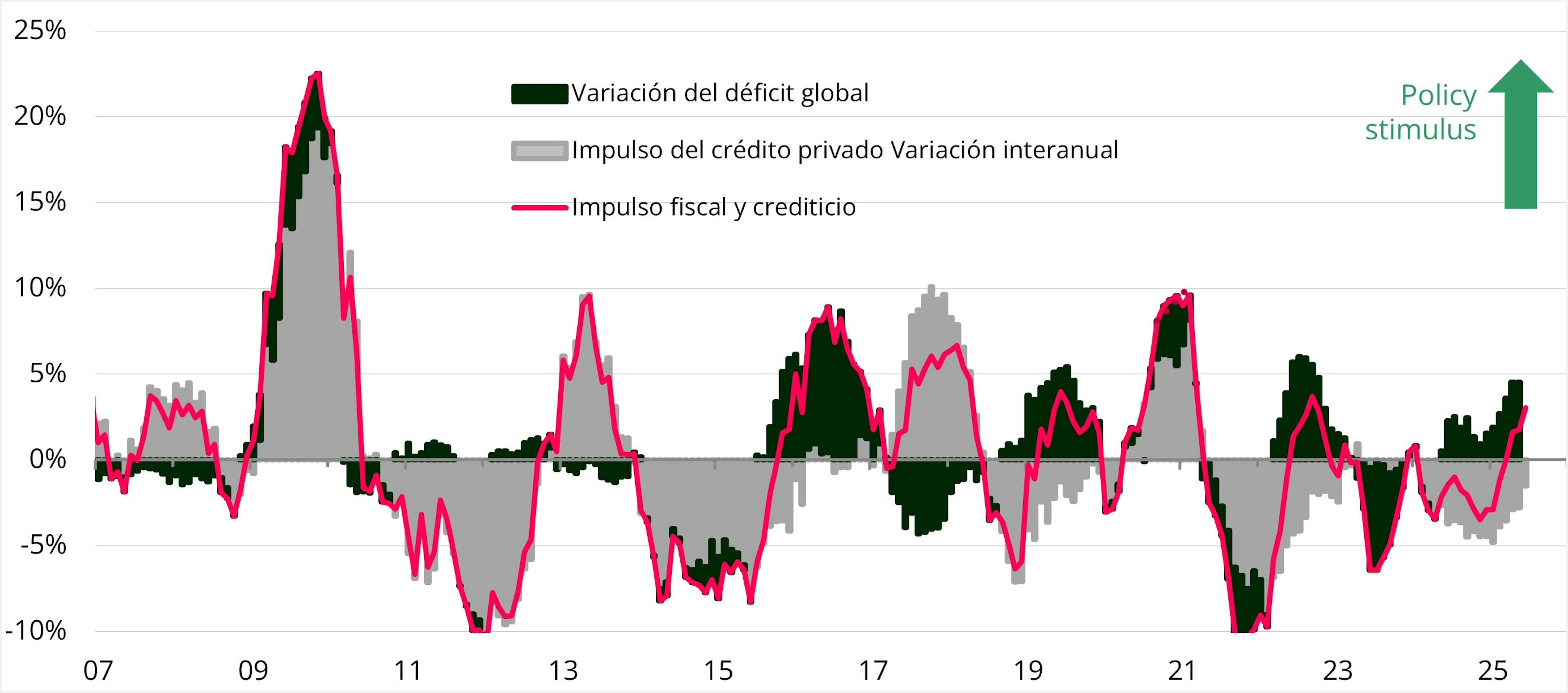Además, estamos asistiendo a una ligera recuperación del impulso crediticio chino y a un aumento del déficit hasta el 15 % del PIB. Estos efectos estimulantes, aún no ampliamente reconocidos, ascienden a alrededor del 4 % del PIB.