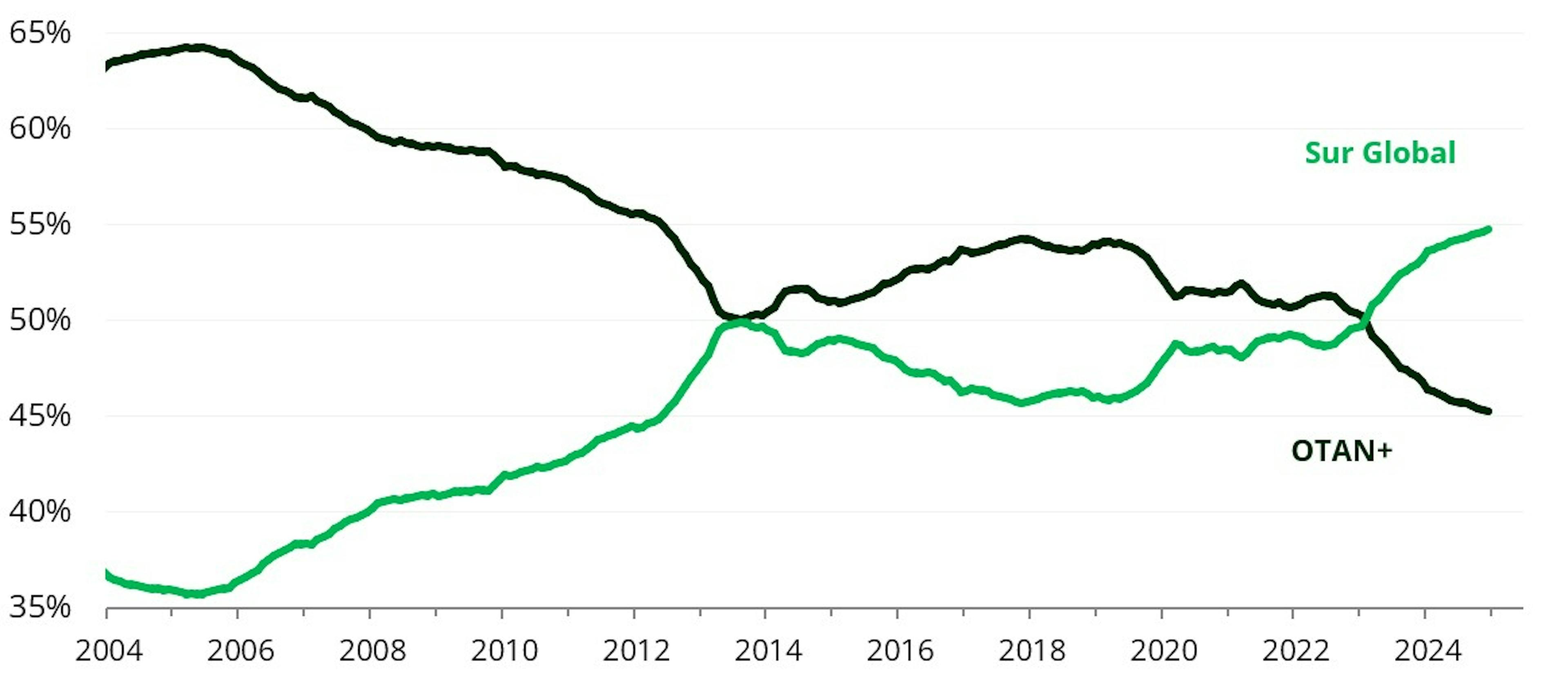 Es importante destacar que consideramos que la probabilidad de que se rompa por completo la relación entre China y Estados Unidos a corto plazo es prácticamente nula, ya que la rivalidad hegemónica existe desde hace tiempo y, al fin y al cabo, ambos países se necesitan demasiado. Lo que cada vez resulta más evidente en esta ocasión es que China tiene demasiadas cartas que jugar como para doblegarse. En nuestra opinión, el desarrollo más interesante es el aumento del comercio de China con otros mercados emergentes, o «el sur global». Décadas de diversificación han hecho que China, y los mercados emergentes en general, sean menos vulnerables a los cambios de política de EE. UU. La transformación de los patrones comerciales ha sido notable: a principios de milenio, EE. UU. era el mayor socio comercial del 80 % de los mercados emergentes. En los 25 años transcurridos desde entonces, esta situación se ha invertido casi por completo y China es ahora el principal socio comercial del 65 % de los mercados emergentes. De hecho, la cuota del comercio entre EM se ha duplicado en los últimos 35 años y ahora representa el 49 % del comercio total de los EM, frente al 24 % en 1990. Mientras tanto, el comercio de los EM con EE. UU. ha perdido importancia, pasando del 18 % al 12 % durante el mismo periodo. Esto demuestra la creciente interconexión de los mercados emergentes y ayuda a explicar la reciente resistencia de las exportaciones chinas, ya que la disminución del comercio con socios desarrollados que se han vuelto mucho más proteccionistas se ha visto totalmente compensada por este nuevo paradigma.