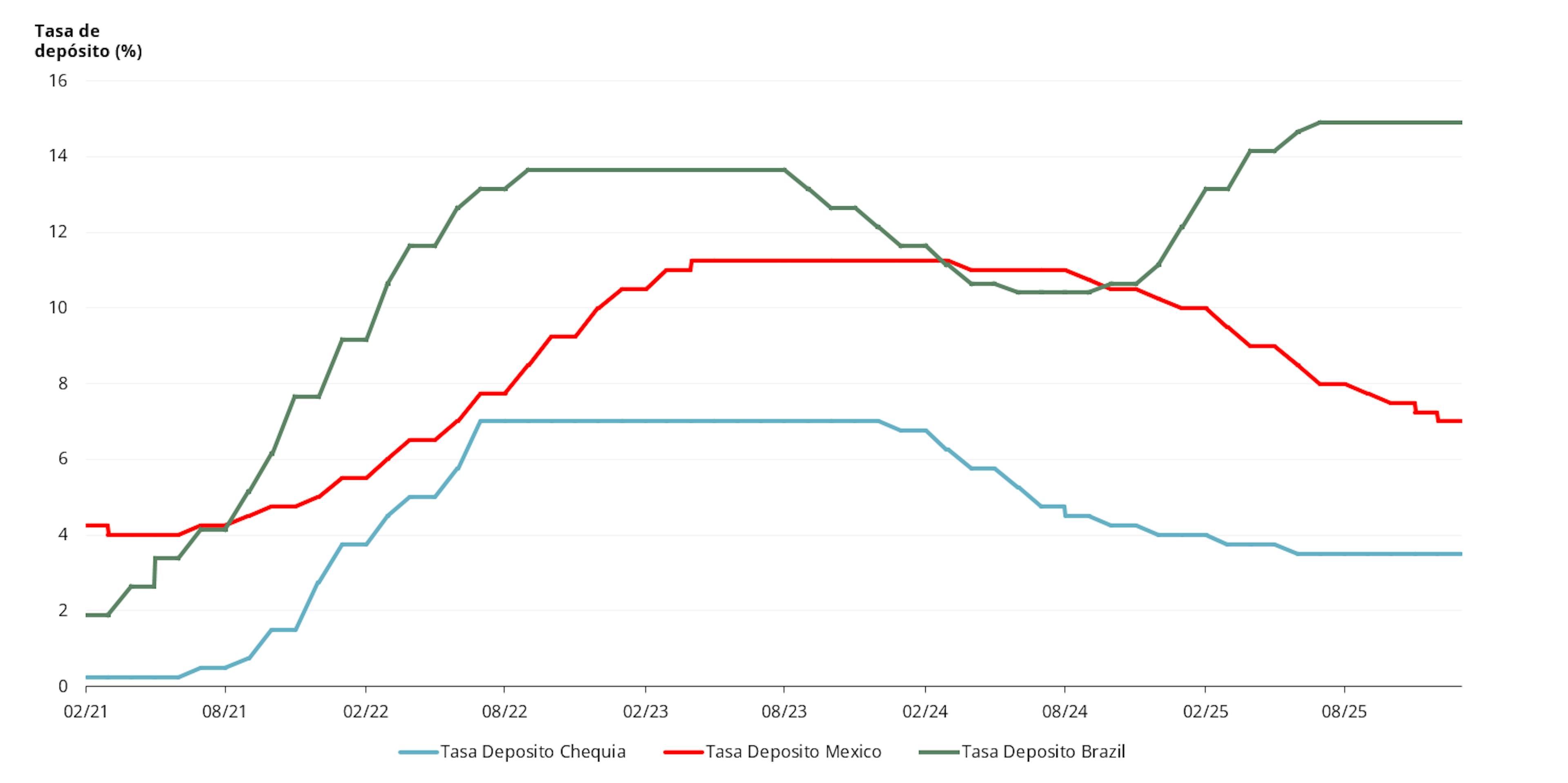Figura 3: Evolución de los tipos de interés oficiales de tres bancos centrales de países emergentes (República Checa, México y Brasil)