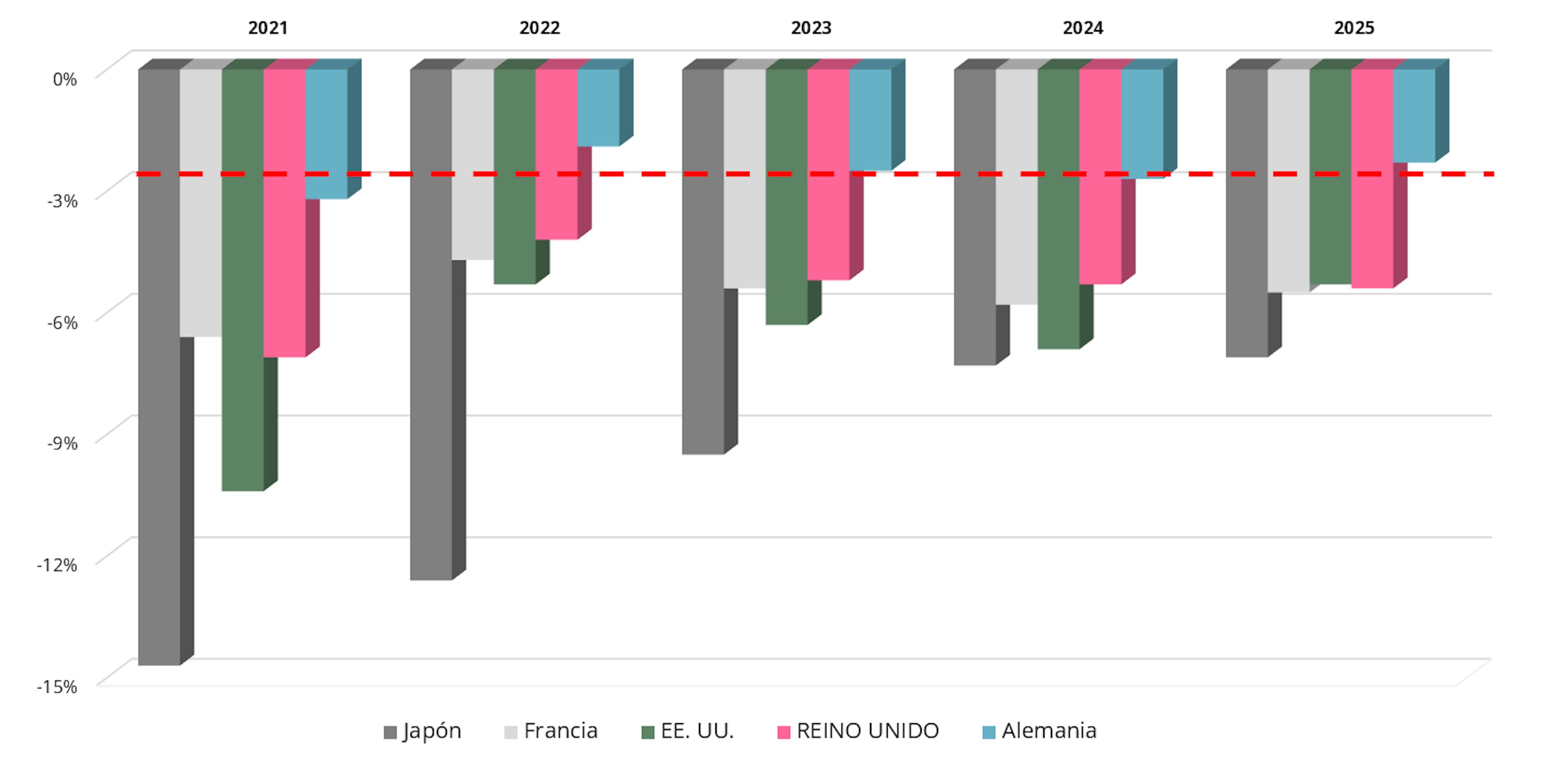 Figura 2: Solo Alemania mantiene un déficit presupuestario anual por debajo del umbral del 3 % del PIB... por ahora