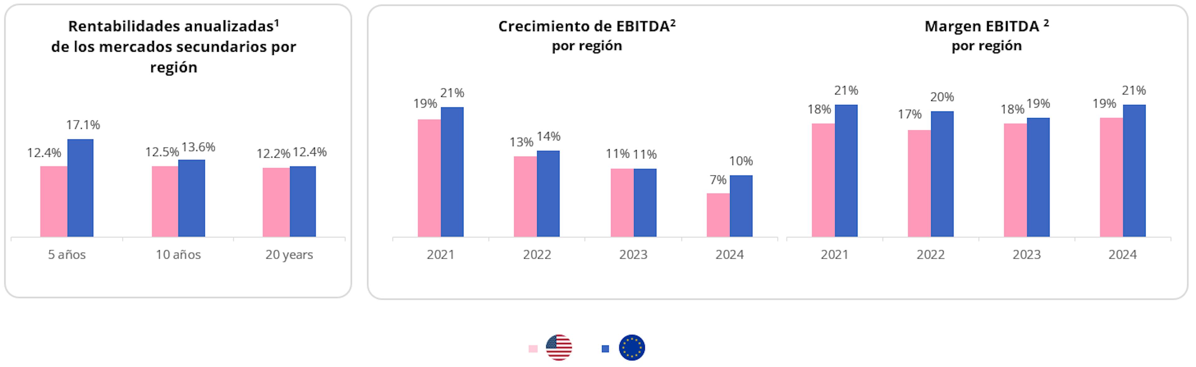 Durante la última década, los fondos europeos de mercados secundarios han obtenido sistemáticamente rentabilidades netas de entre el 12% y el 17%, superando a menudo a sus homólogos estadounidenses, como se muestra a continuación. Pero lo que importa aún más que las cifras, es cómo se han generado esas rentabilidades, propiciadas por factores fundamentales como el crecimiento de los ingresos y la expansión de los márgenes.