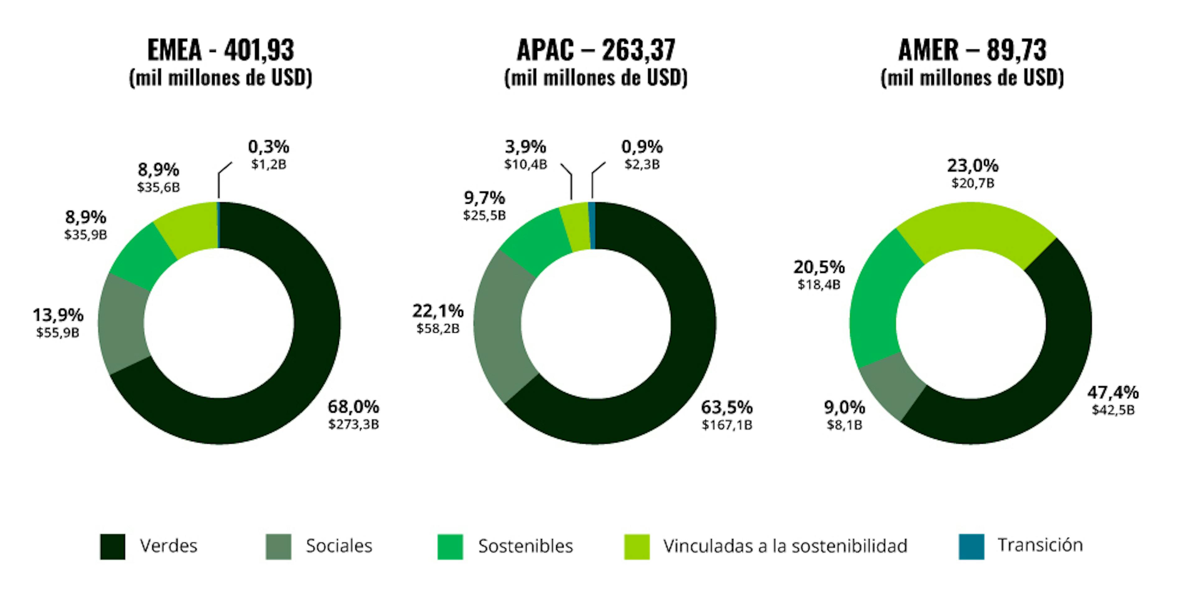 Los datos de 2023 ponen de relieve una emisión histórica de bonos verdes UoP, que predominaron en las regiones de EMEA, APAC y América, así como un marcado descenso en los volúmenes de emisión de bonos SLB.