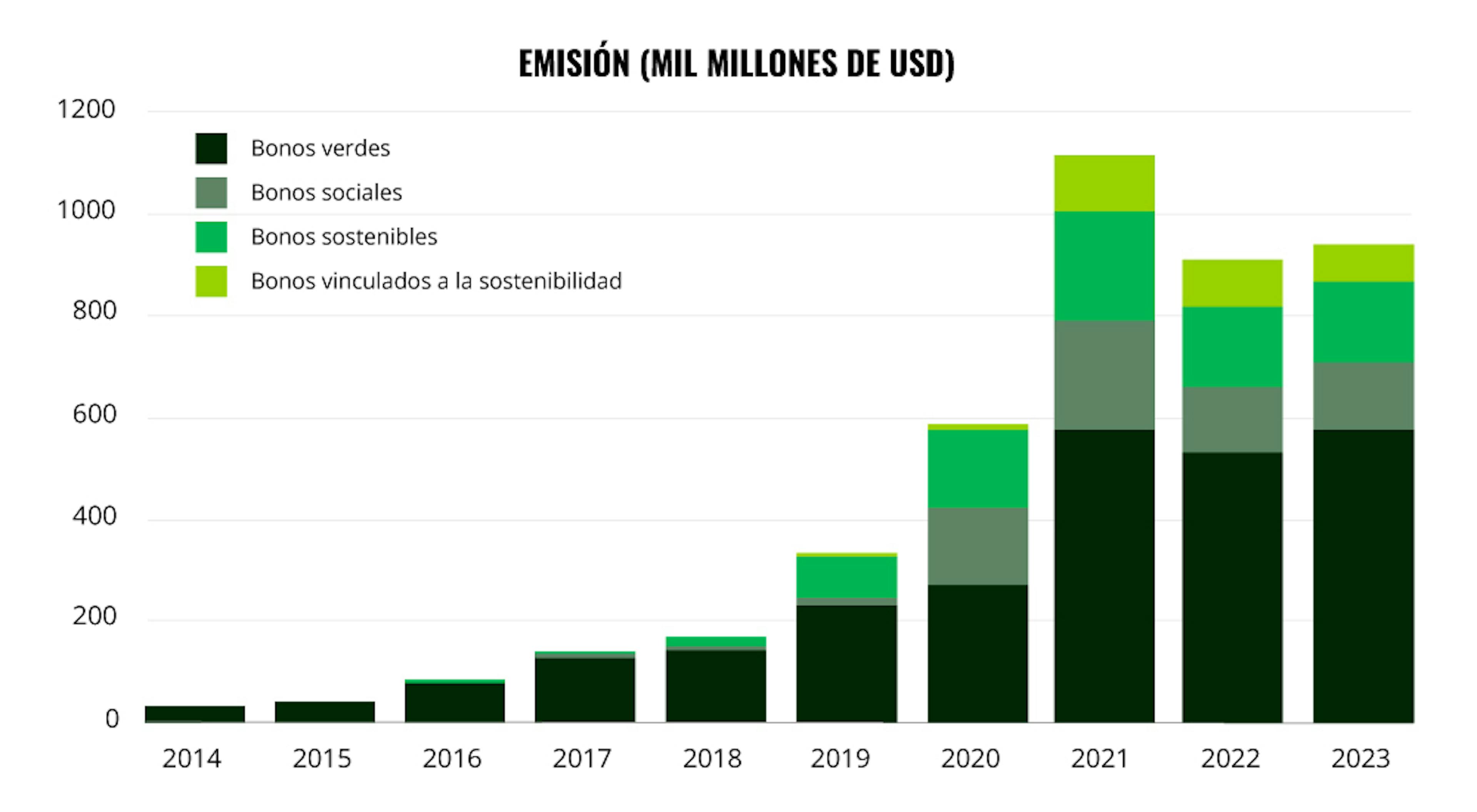 Según Bloomberg, las emisiones de bonos verdes por parte de empresas y gobiernos ascendieron a 575.000 millones de dólares, superando las de 2022 y batiendo los 573.000 millones de dólares de 2021. Por el contrario, los bonos SLB protagonizaron el mayor descenso interanual en volumen de emisión en 2023, del 22% hasta los 68.000 millones de dólares.
