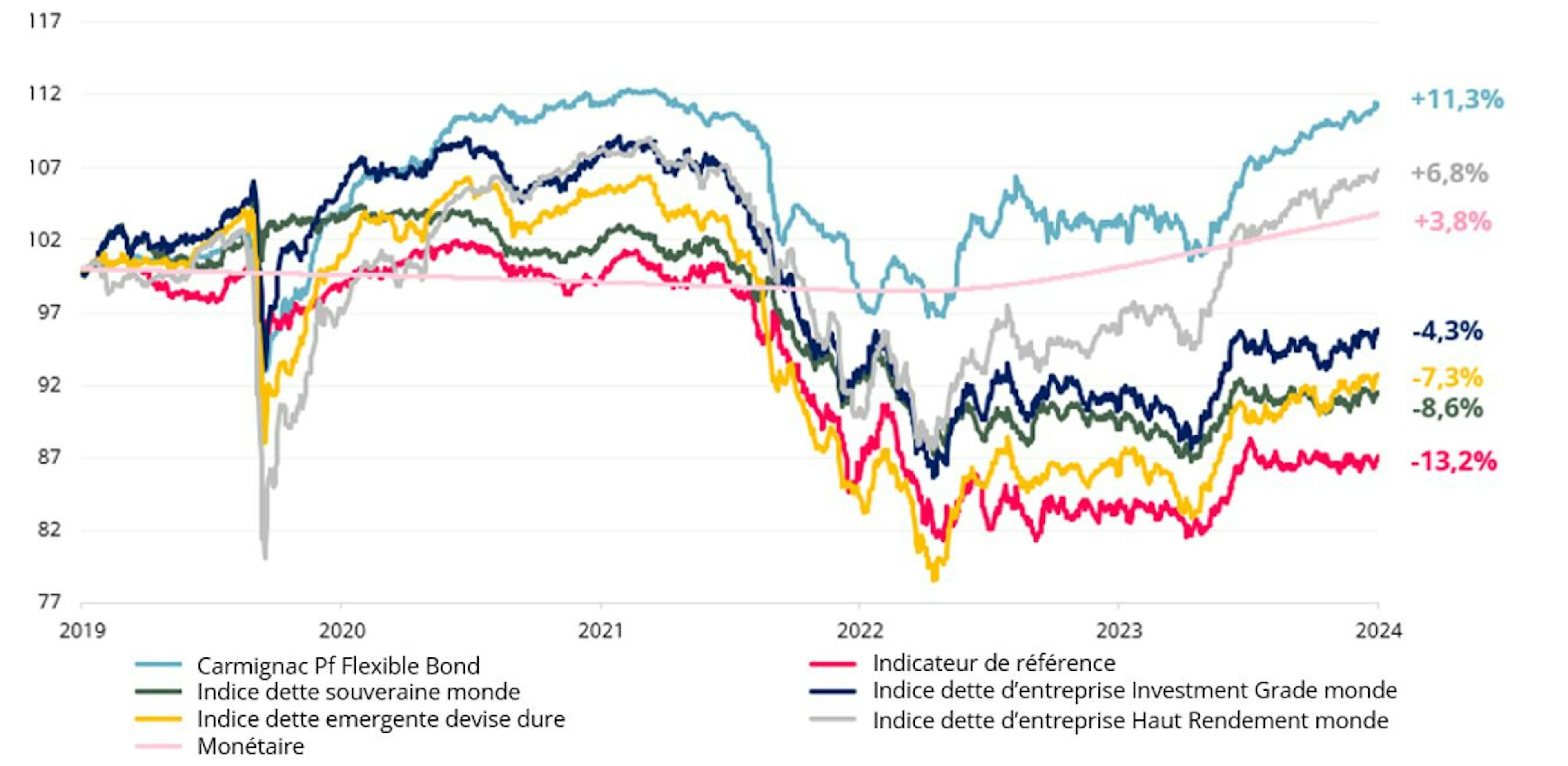 Surperformance de Carmignac P. Flexible Bond par rapport à d'autres segments obligataires sur les 5 dernières années :