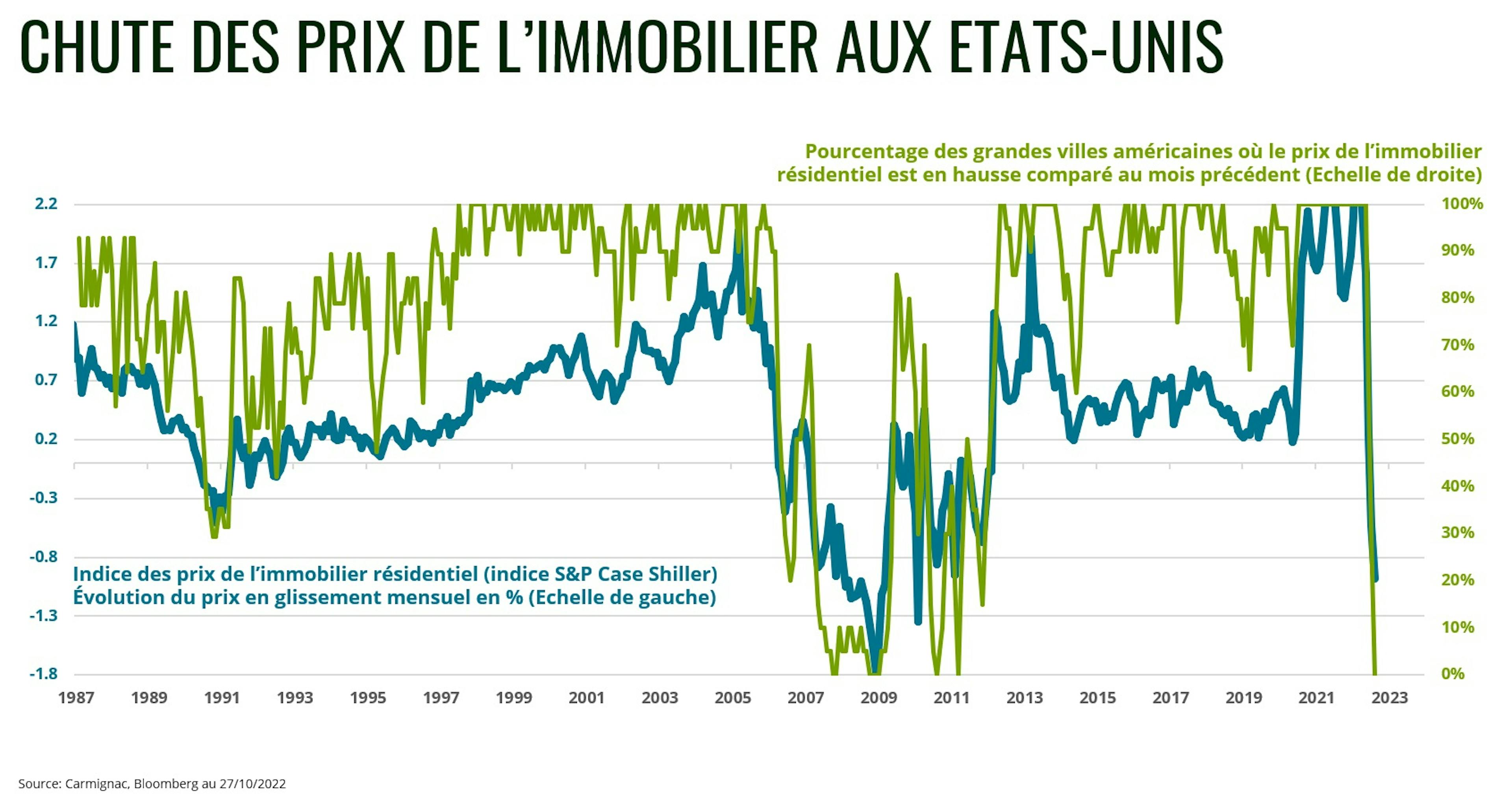 Si le marché immobilier se retourne avec une rare violence aux Etats-Unis - comme illustré par ce graphique -, cette chute concerne les prix des logements et non des loyers, qui sont la composante la plus importante de l’indice des prix à la consommation. Or les loyers réagissent traditionnellement avec deux à trois trimestres de retard à l’évolution des prix de l’immobilier car lorsque l’acquisition d’un logement devient impossible à cause de prix ou de taux d’intérêt trop élevés, la location est la seule alternative à l’achat ; ce qui fait monter les loyers.