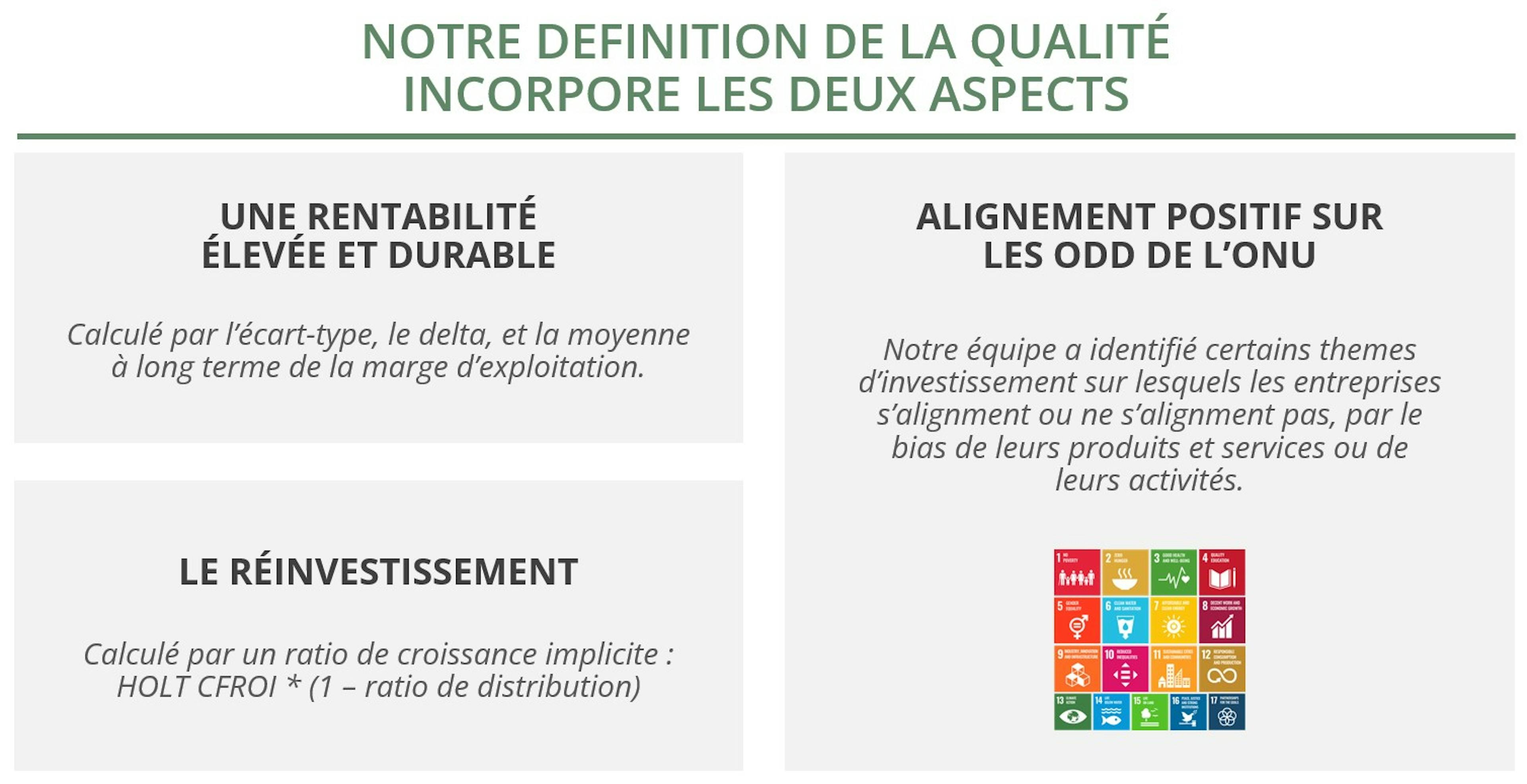 Depuis plus de 20 ans, la conviction de Mark Denham, co-gérant de la stratégie, est que la performance de long terme repose exclusivement sur la capacité à sélectionner les entreprises qui offrent les meilleures perspectives. Ces entreprises, qualifiées de "qualité" selon Mark, doivent répondre à des critères objectifs précis :