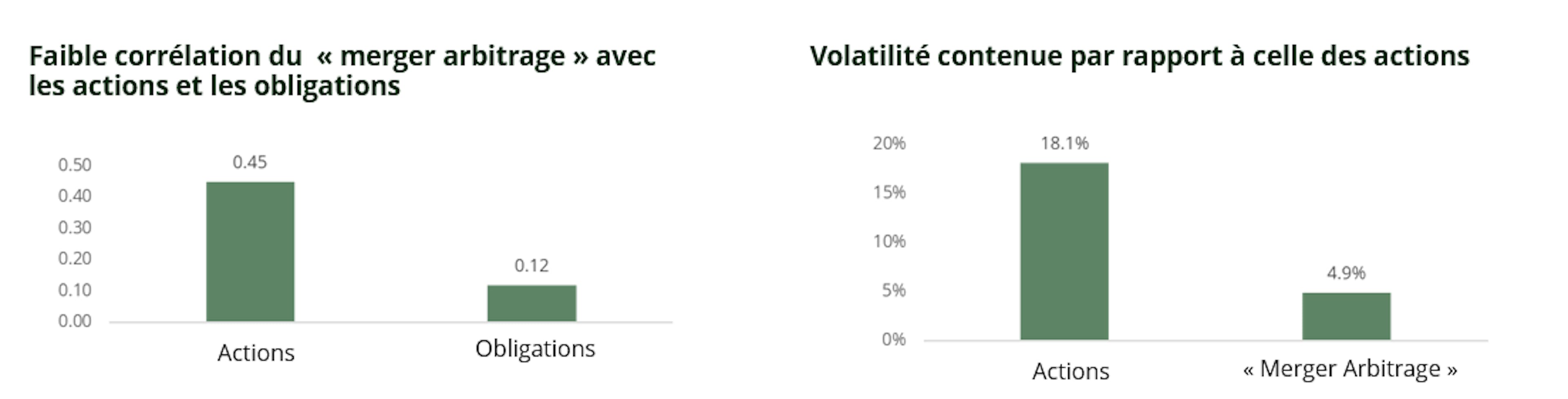Le « Merger Arbitrage » est une stratégie alternative dont l’objectif est de tirer profit des différences de prix observées après l’annonce d’une opération de fusion ou d’acquisition (M&A : merger and acquisition) sur une société cotée. Elle convient particulièrement à l’environnement de marché actuel, car elle offre une couverture efficace contre les hausses de taux et l’inflation. Cette stratégie s’avère d’ailleurs souvent moins volatile que les actions et présente une faible corrélation avec les classes d’actifs traditionnelles telles que les actions et les obligations.