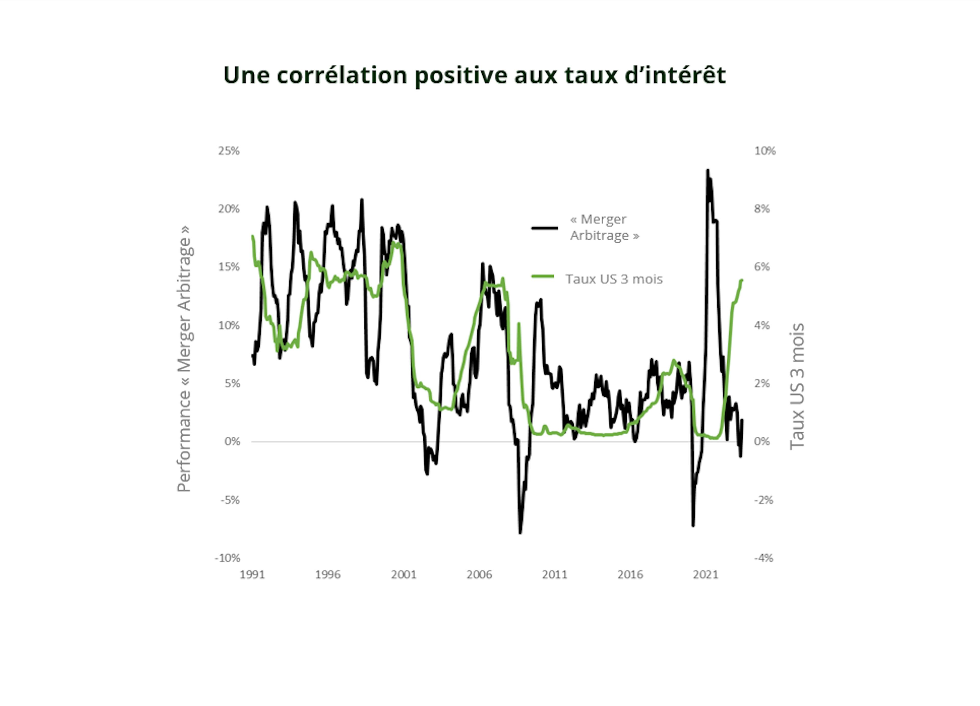 Sur une longue période, on observe bien ce phénomène. De 1990 à 2008, les rendements de « Merger Arbitrage » suivent effectivement les variations des taux à la baisse, comme après l’éclatement de la bulle Internet en 2001, et à la hausse lors de la phase de reprise économique de 2004 à 2007. Mais à partir de la crise de 2008, cette corrélation se trouve disloquée sous l’effet de la longue période de taux à 0% imposée par les banques centrales.