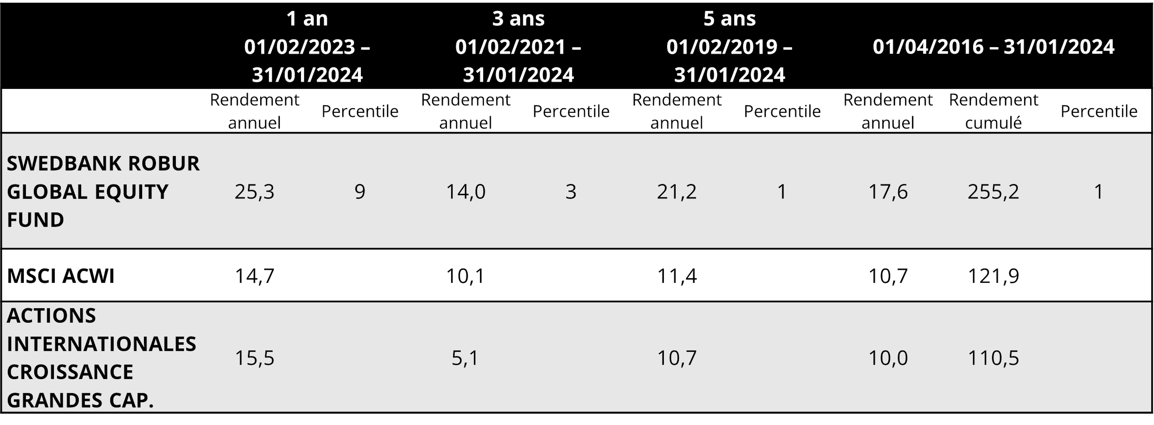 201/04/2016 – 31/01/2024. Stratégie = 255,2 %, Indice (MSCI ACWI) = 121,9 %, moyenne de la catégorie (actions internationales croissance grands cap.) = 110,5 %. Encours sous gestion = de 1,8 Md€ à 10 Md€. Performance mesurée en euros.