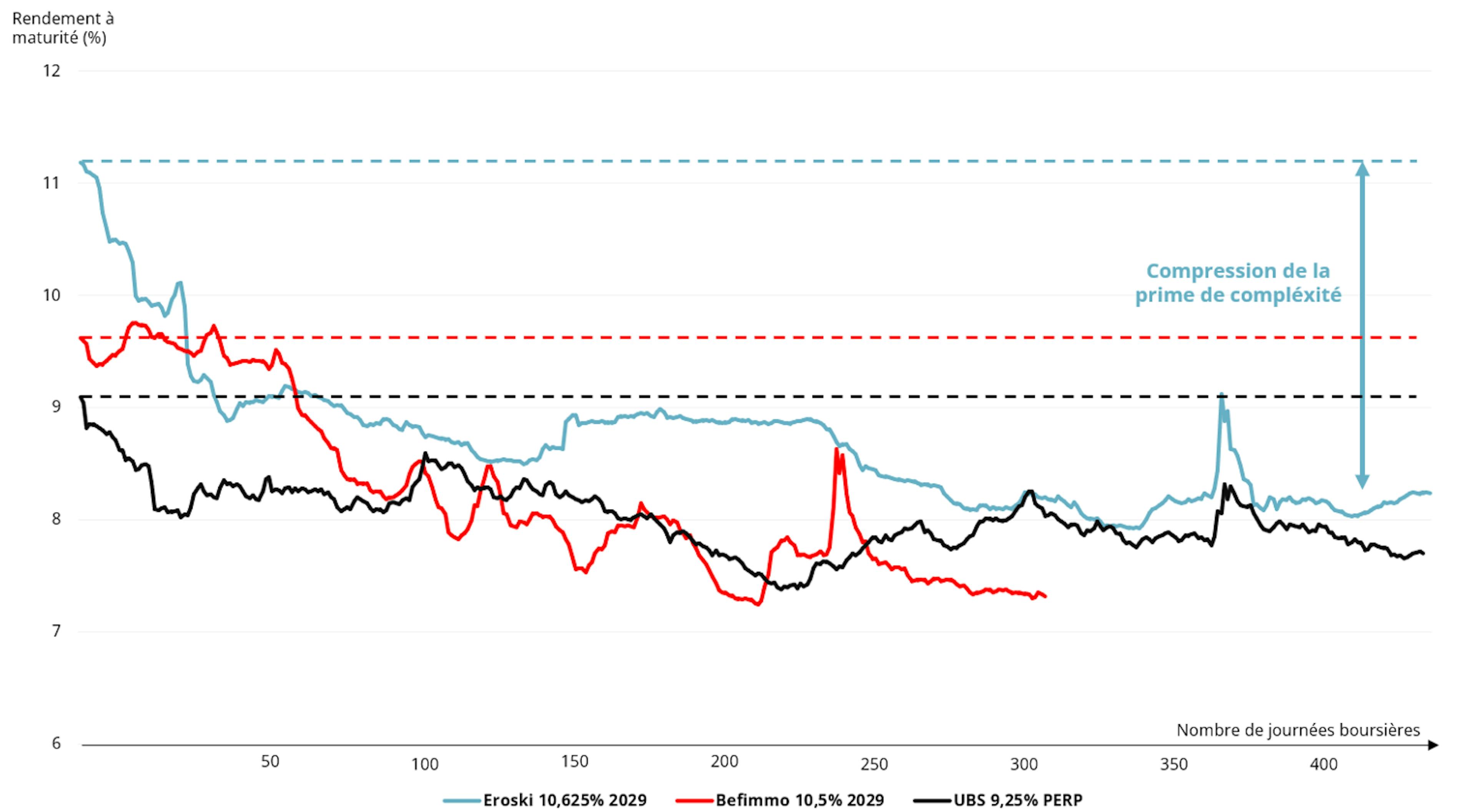 Graphique 3 : Évolution du rendement à maturité de trois obligations – Compression de la prime de complexité des émetteurs