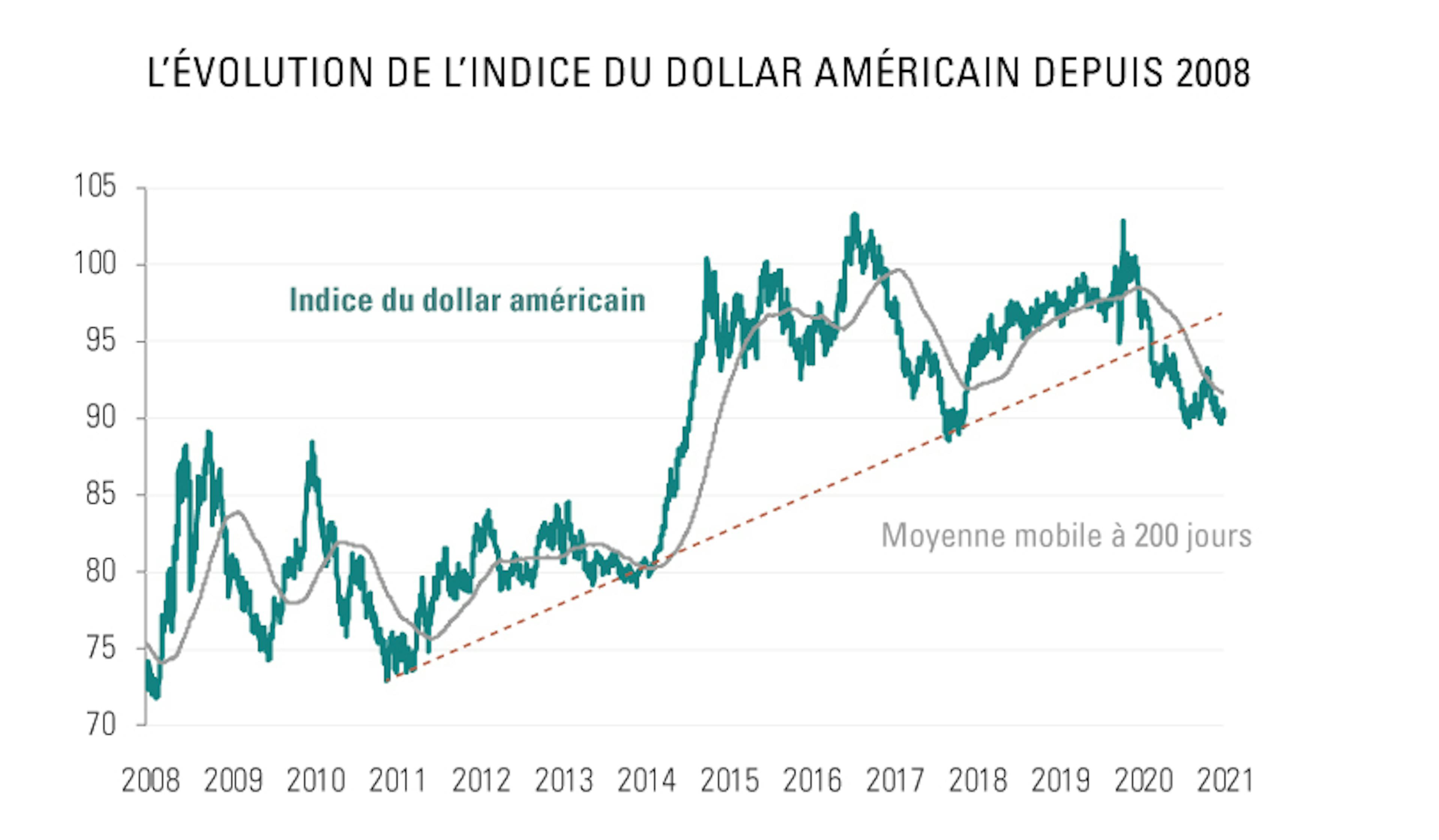 Source : Bloomberg, 07/06/2021. Valeur du dollar vis-à-vis d’un panier de grandes devis mondiales