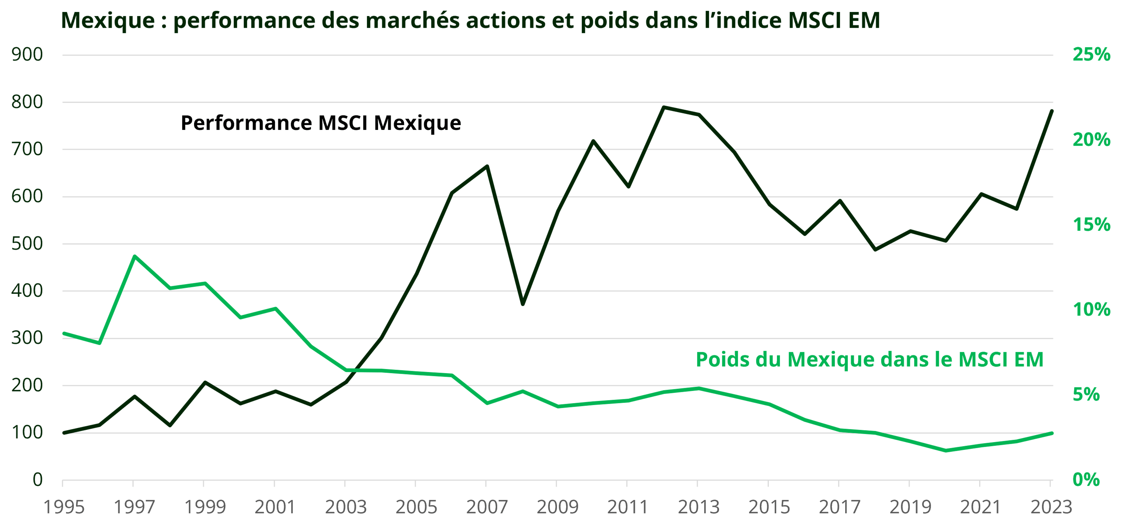 A titre d’exemple, le marché des actions mexicain a atteint un niveau record, alors que sa pondération dans l'indice MSCI Emerging Markets (« MSCI EM ») est proche de son plus bas niveau historique (2,8%). C'est une excellente illustration du retard pris par les indices pour refléter les changements que nous observons sur les marchés émergents.