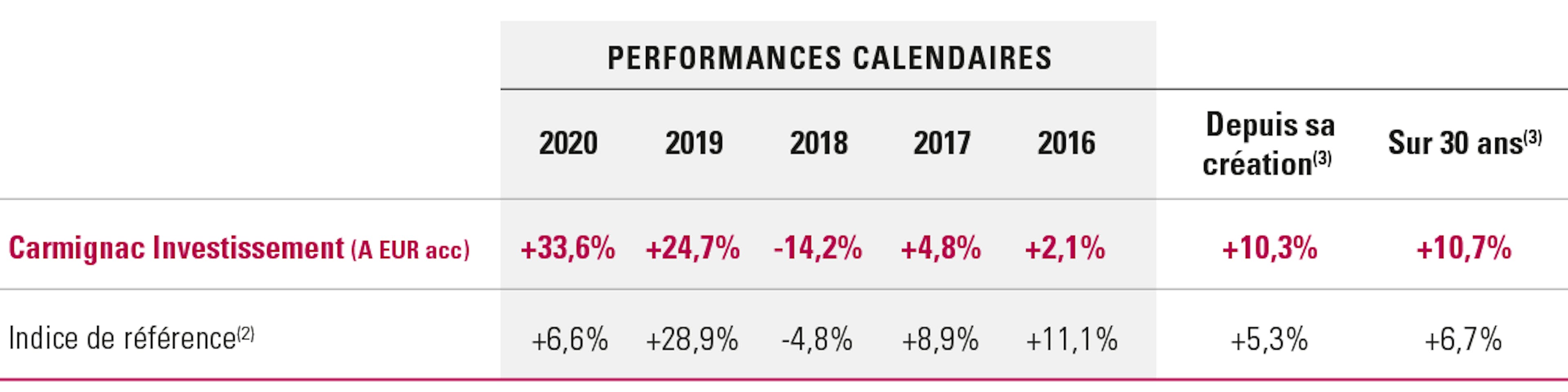 Source : Carmignac, 31/12/2020. (2) Indicateur de référence : MSCI AC World NR (USD) (dividendes nets réinvestis). (3) Les performances depuis la création et sur 30 ans sont annualisées.