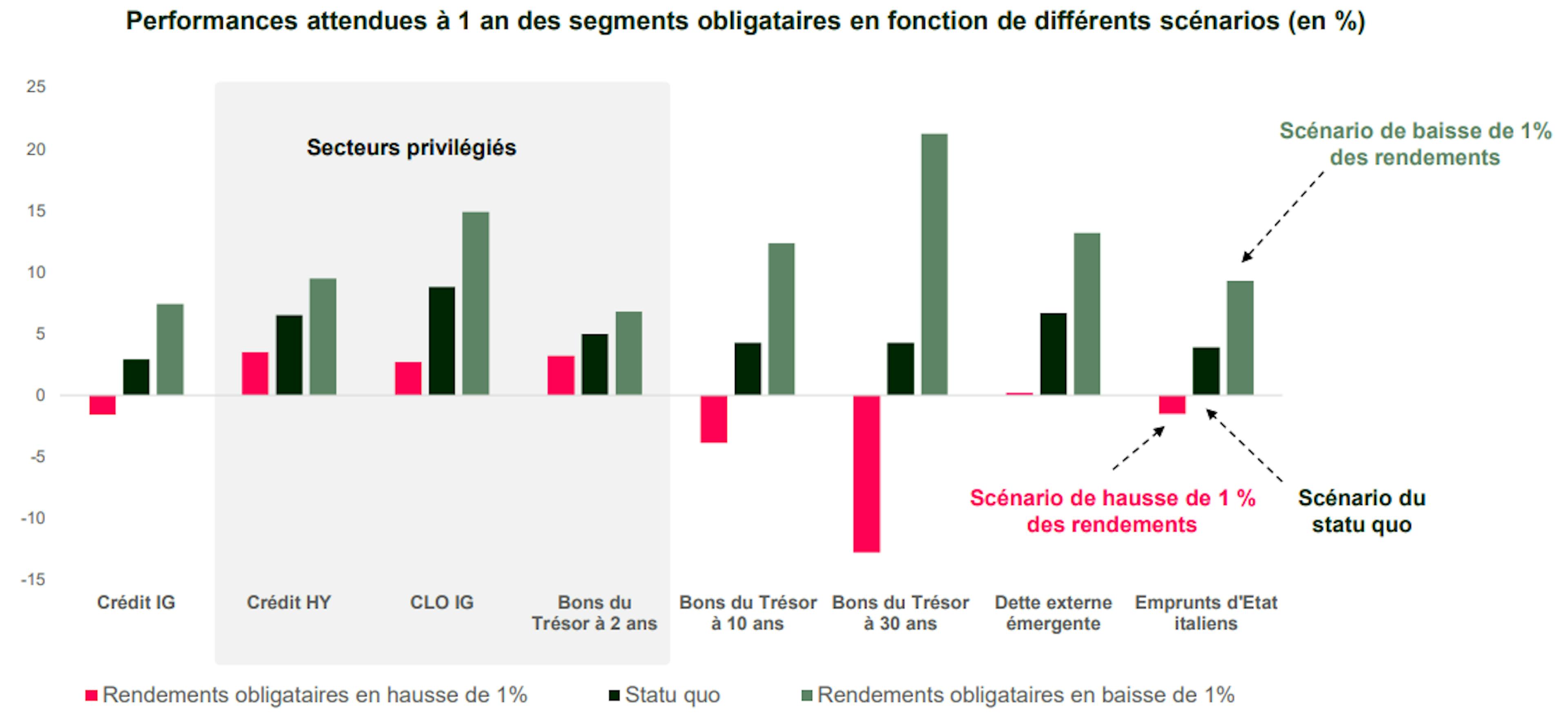 La question qui se pose est donc la suivante : si la situation actuelle évolue et si les marchés obligataires délivrent une performance différente du rendement « promis » (le scénario central des segments obligataires dégageant le rendement affiché est illustré par les bâtons noirs sur le graphique ci-dessus), à quoi peut-on s’attendre ? Quel en serait l’impact sur les marchés obligataires ?