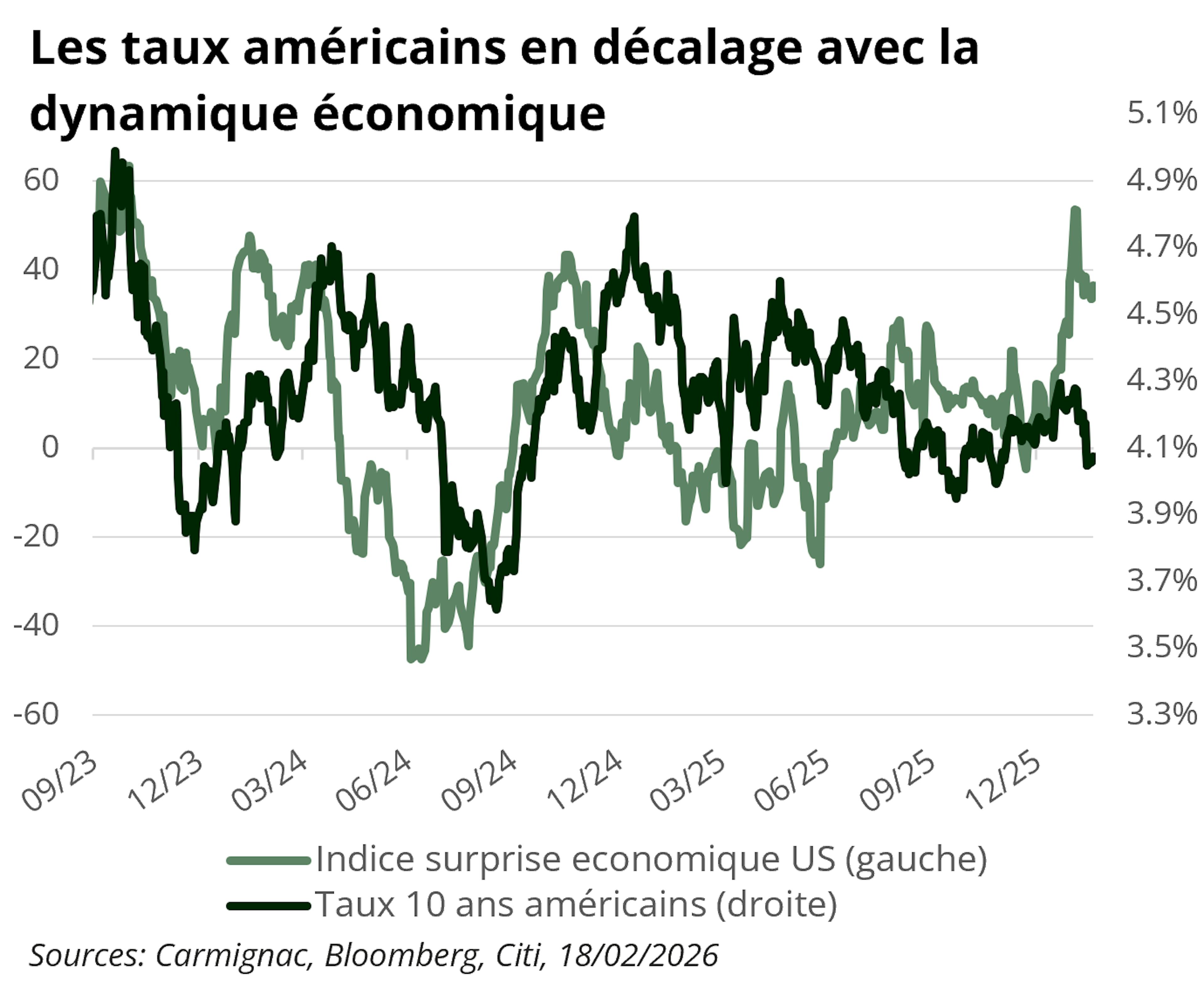 La référence à certains titres et instruments financiers est fournie à titre illustratif, afin de mettre en avant des valeurs ou des positions qui sont ou ont été incluses dans les portefeuilles des fonds de la gamme Carmignac. Elle ne vise pas à promouvoir un investissement direct dans ces instruments et ne constitue en aucun cas un conseil en investissement. Source : Carmignac, 20/02/2026.