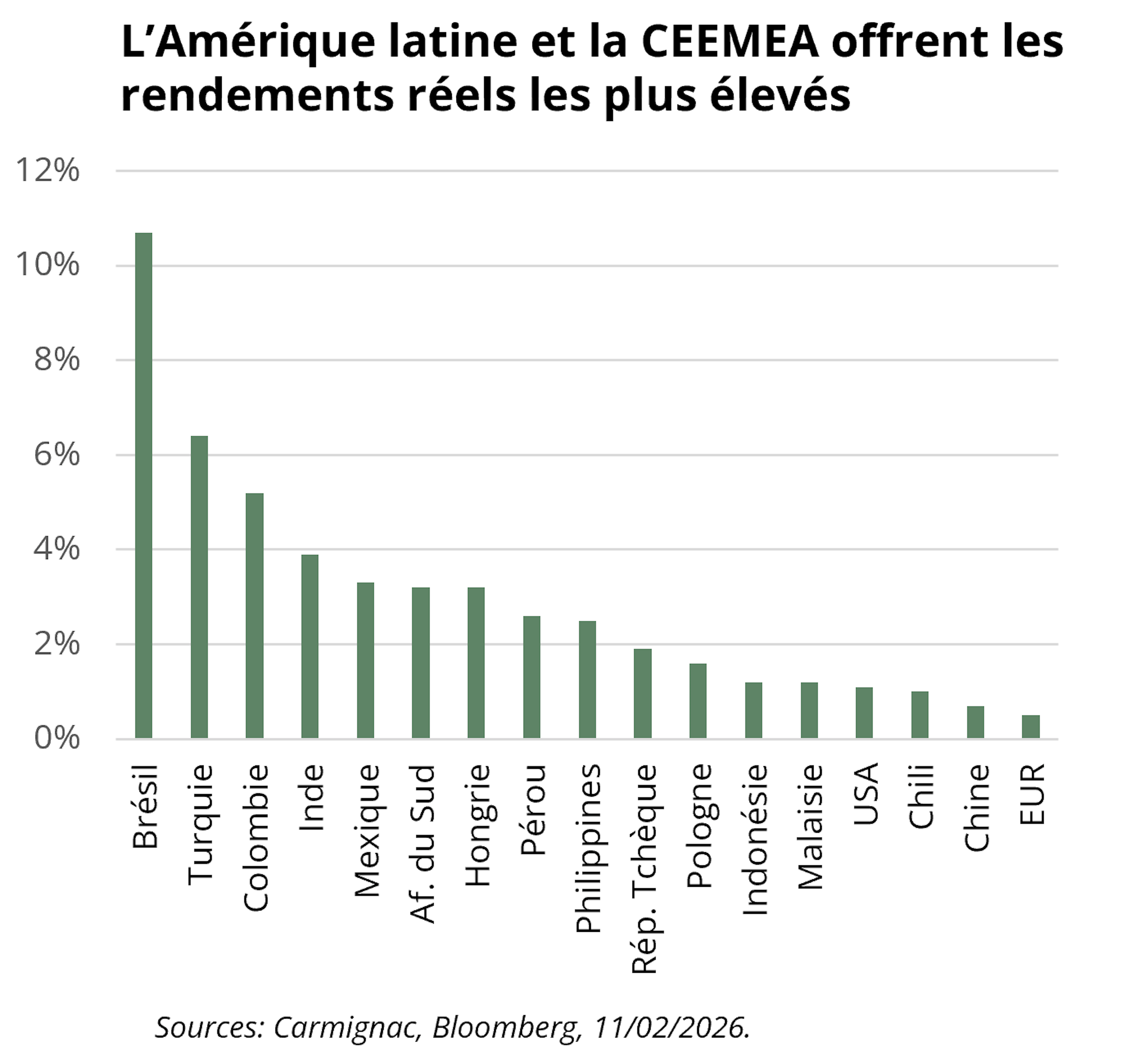 • Sur les marchés émergents, le portage en devise locale et la résilience structurelle justifient un positionnement constructif, notamment en Europe de l’Est et en Amérique latine.