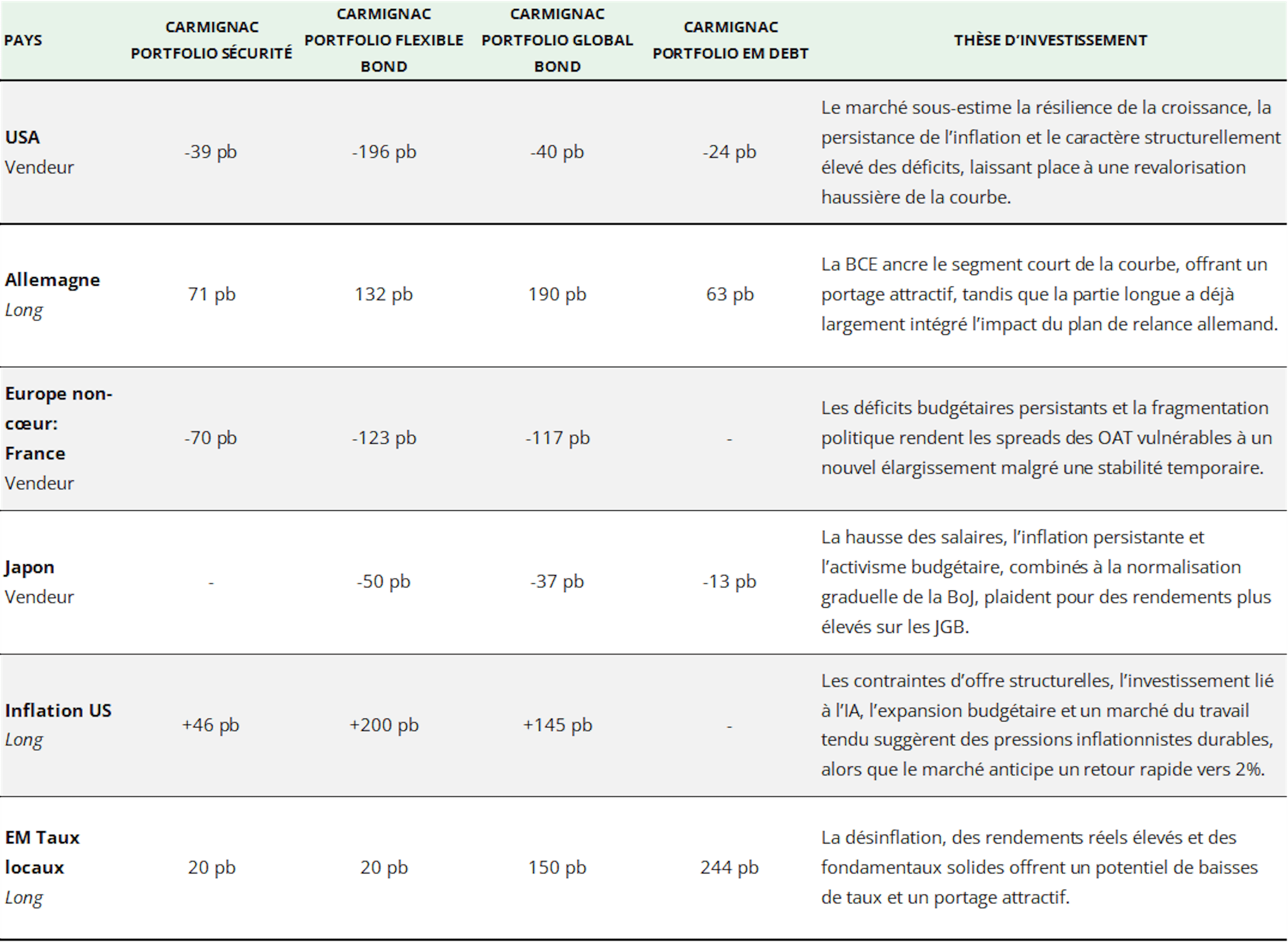 Dans ce contexte, nous privilégions une exposition différenciée en sensibilité aux taux : vendeurs sur les États-Unis et le Japon, acheteurs sur l’Allemagne, prudents sur l’Europe non-cœur et constructifs sur certains marchés émergents sélectionnés.