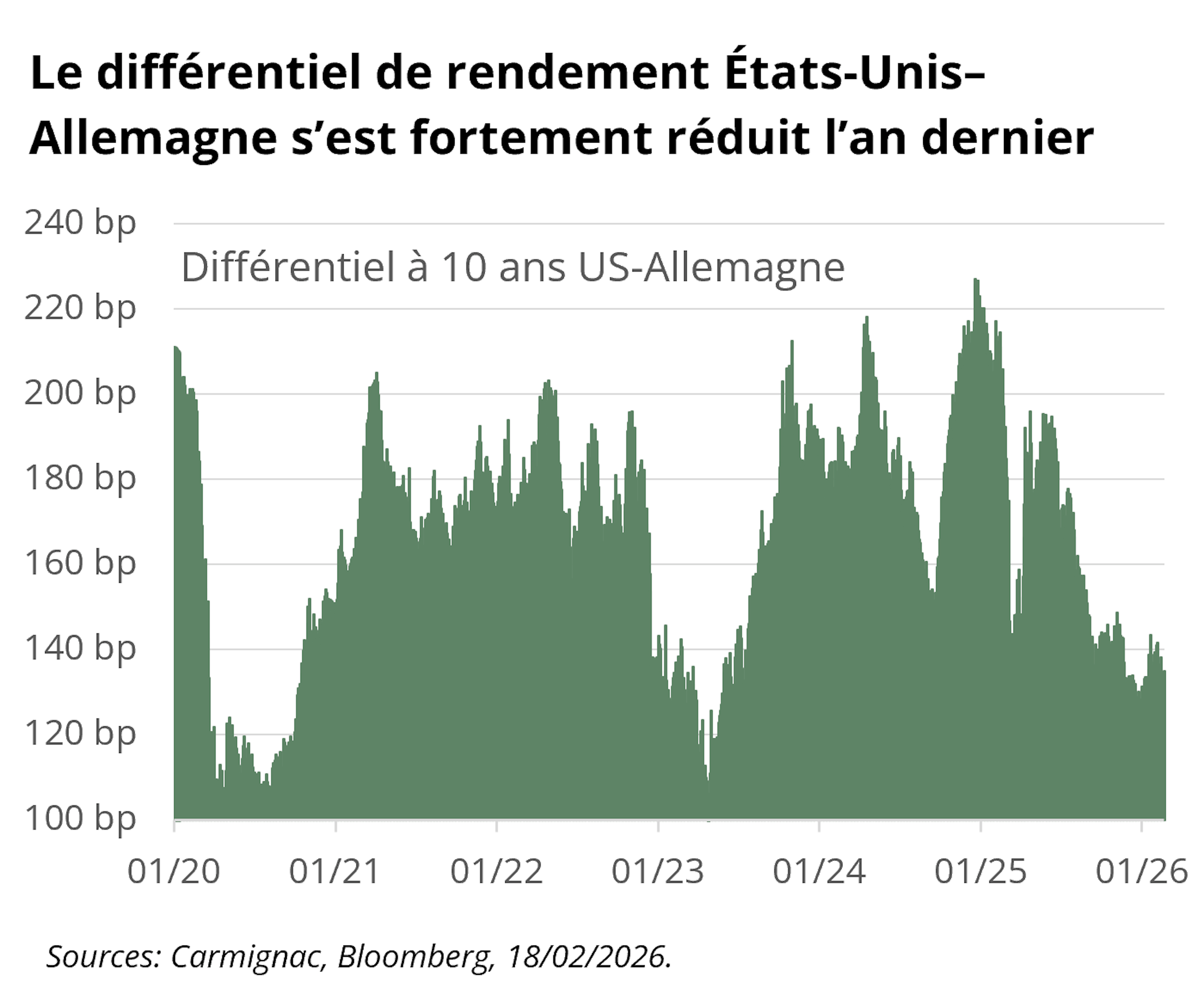 S’agissant des taux allemands, le message est clair. Le segment court de la courbe demeure solidement ancré par la politique de la BCE et offre un portage attractif, élément clé dans un environnement en voie de stabilisation. La partie longue a déjà intégré une large part du stimulus budgétaire, les rendements du Bund ayant fortement progressé l’an dernier. Les Bunds conservent en outre leur statut de valeur refuge, notamment dans un contexte d’incertitude accrue sur la politique américaine pesant sur les perspectives des obligations du Trésor. Notre positionnement privilégie donc le segment court de la courbe allemande, où la valeur relative par rapport aux États-Unis demeure attractive.