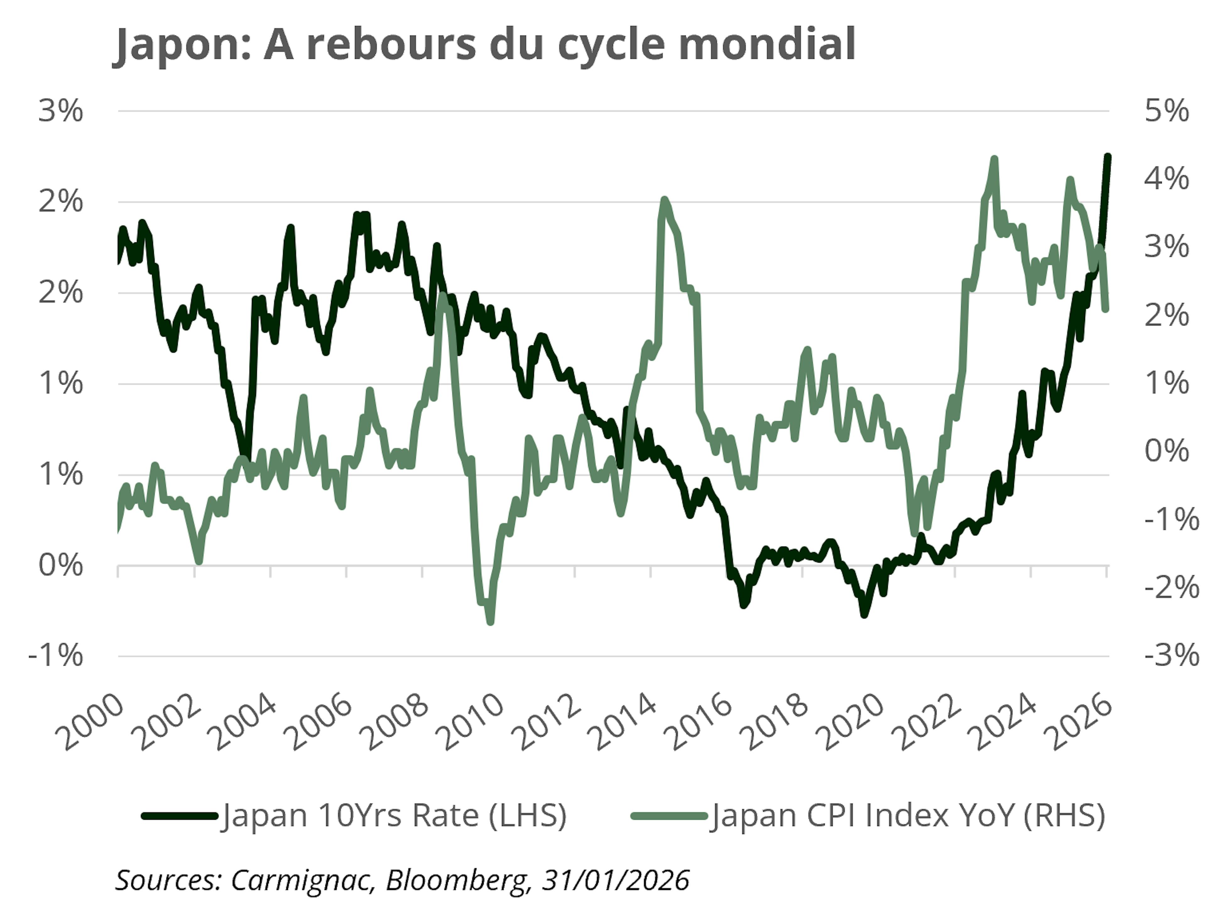 Pour les marchés obligataires, les implications sont significatives. Le niveau d’endettement n’est pas nouveau, mais l’environnement de financement a changé. Les anticipations d’inflation ne sont plus ancrées à zéro et, même si les pressions globales se modèrent, une volatilité accrue plaide pour une reconstitution des primes de terme. À mesure que la Banque du Japon se retire progressivement et que les investisseurs privés absorbent une part croissante des émissions, la rémunération du risque de sensibilité aux taux et du risque d’inflation devrait augmenter. La normalisation est prudente mais déterminée : le contrôle de la courbe des taux a été progressivement assoupli et les taux directeurs sont redevenus positifs.