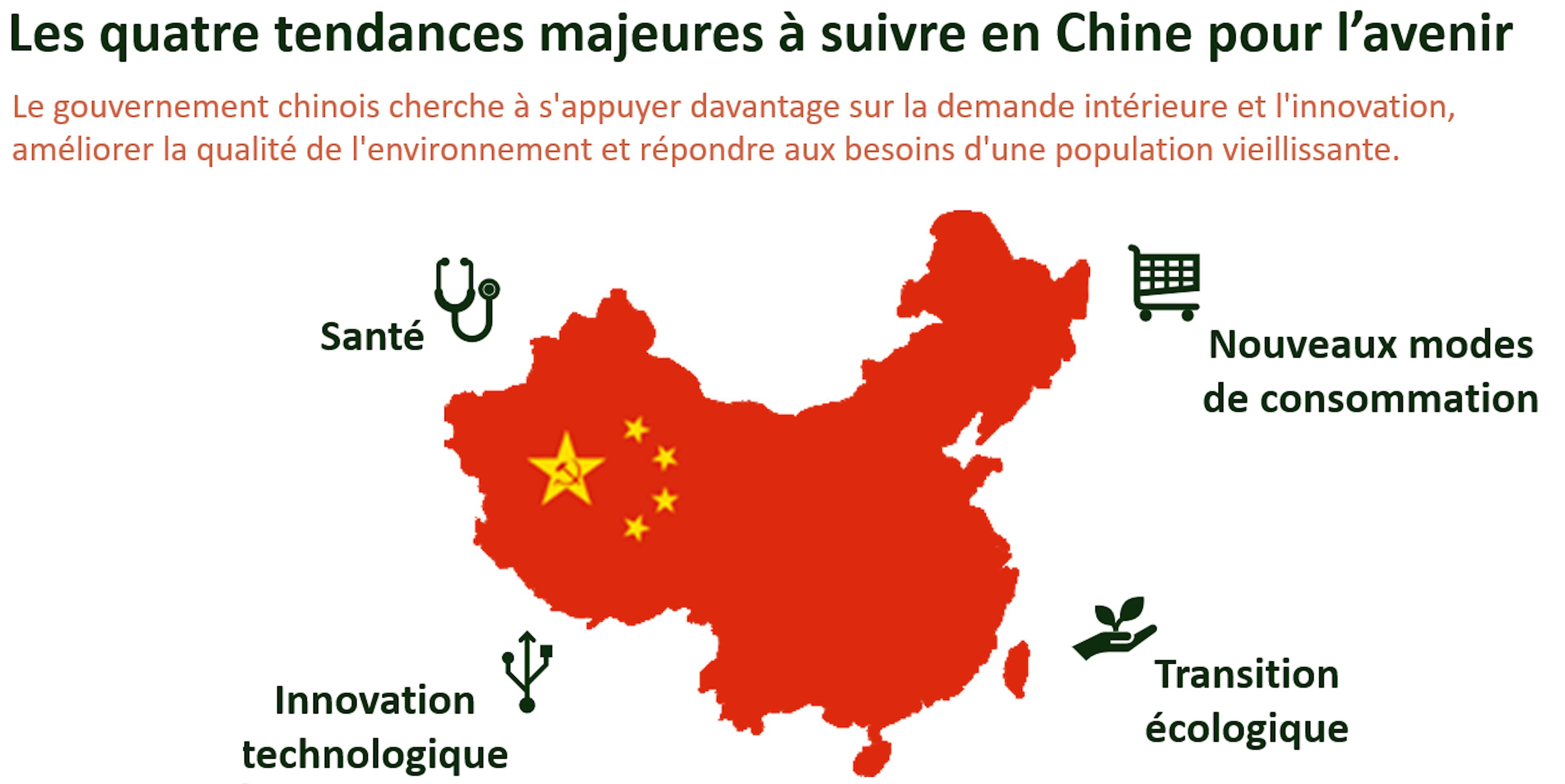 Le gouvernement chinois a ainsi annoncé un plan de développement 2021-2035 pour répondre à ces enjeux démographiques et économiques, mais aussi créer de nouveaux moteurs de croissance. Les réformes qui en découlent font ressortir quatre tendances majeures de long terme qui offrent de nombreuses opportunités d’investissement : l’innovation technologique, la transition écologique, l’évolution des modes de consommation, la santé et les innovations médicales.