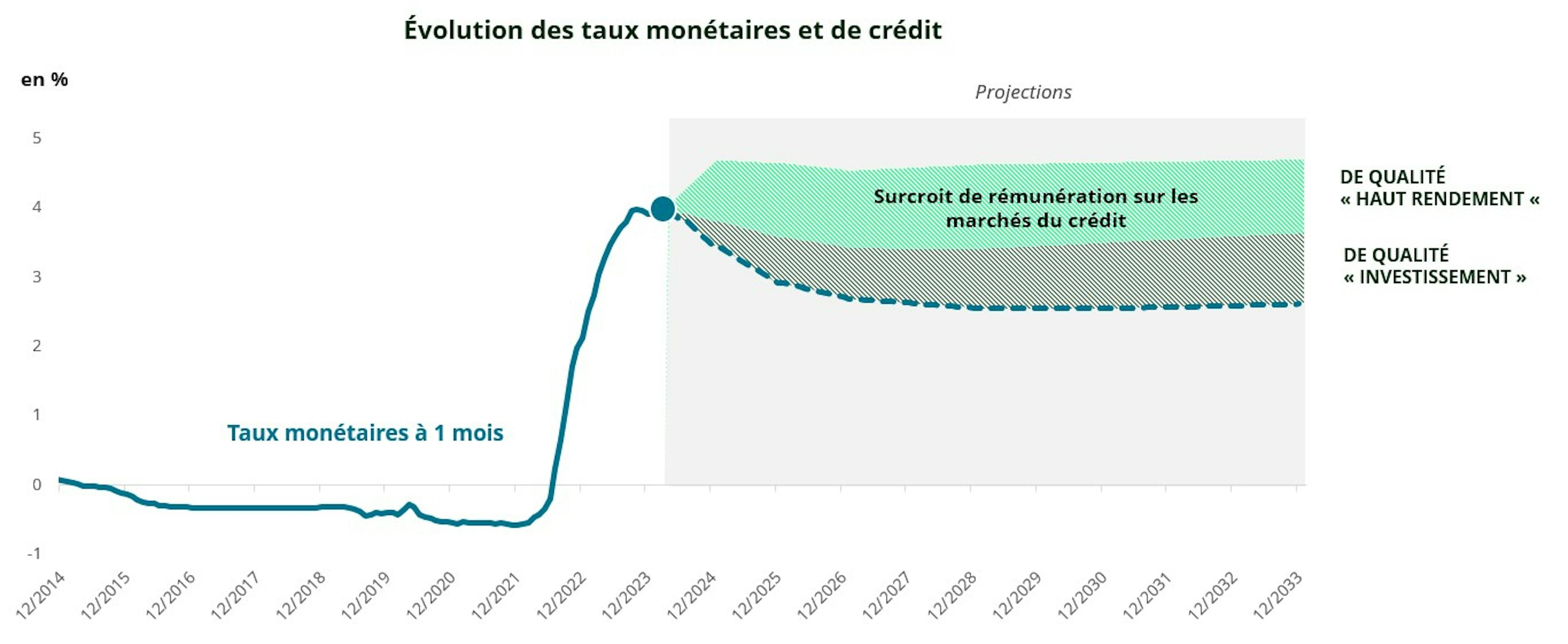 Il convient de s’assurer dès aujourd'hui des rendements attractifs pour l’avenir. Les marchés du crédit offrent un surcroît de rendement qu’un investisseur peut capter pour les trimestres, voire les années, à venir - la zone verte hachurée sur le graphique correspond à la rémunération additionnelle qu’offrent actuellement les marchés du crédit en comparaison du taux monétaire. Autrement dit, il s’agit du « manque à gagner » pour tout investisseur qui ferait le choix de maintenir ses positions sur les marchés monétaires ou qui tarderait à réallouer son capital – comprise entre 1% et 2% par an, cette carence de performance est loin d’être négligeable.