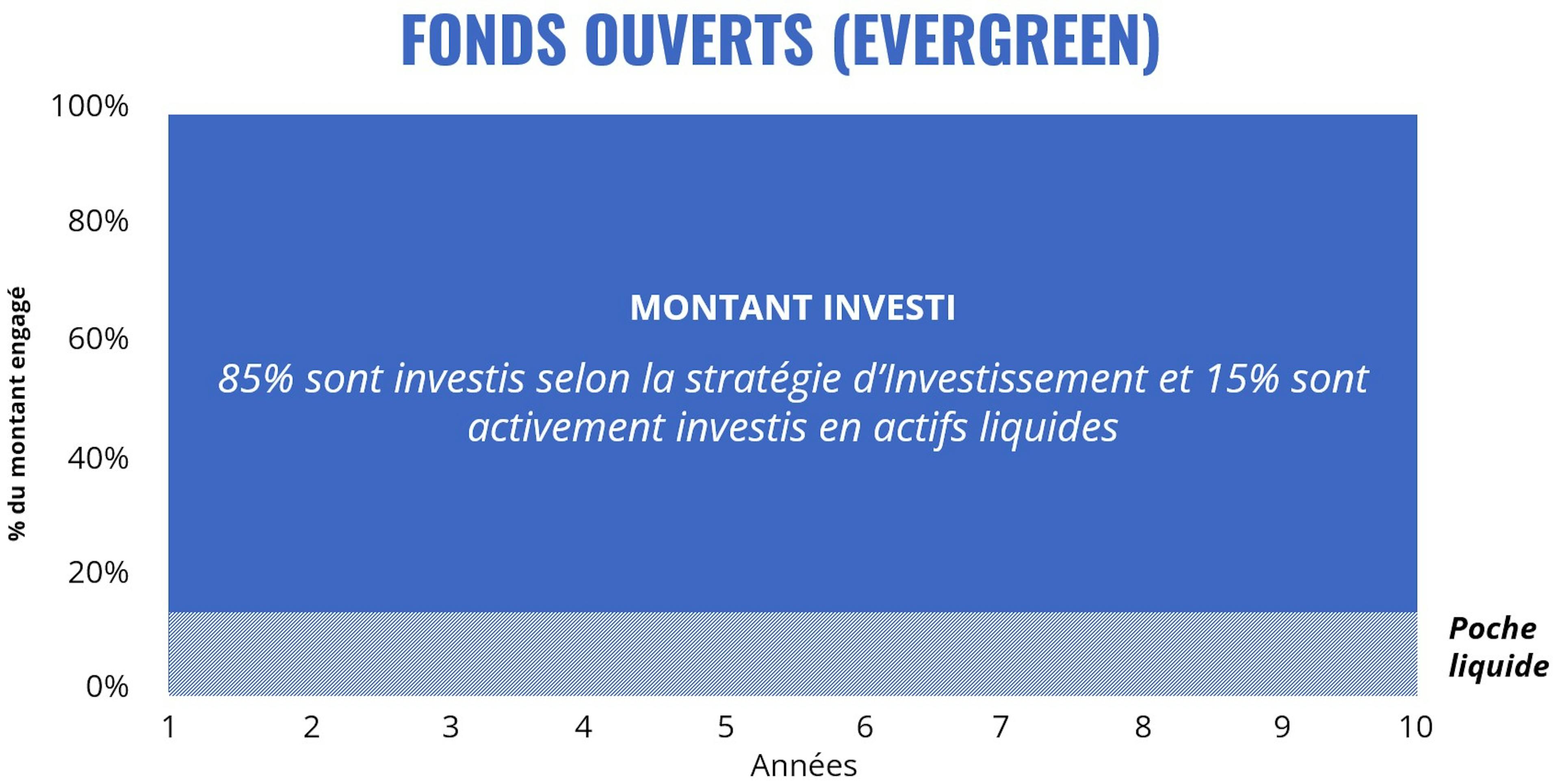 Les fenêtres de liquidité périodiques des fonds Evergreen, proposées par la possibilité d’effectuer des rachats périodiques, permettent aux investisseurs qui le souhaitent d'ajuster leur allocation. Ces fenêtres de liquidité leur permettent d'accéder à leur capital avec plus de souplesse que les fonds de Private Equity traditionnels. Les investissements réalisés dans les fonds fermés sont généralement bloqués pour la durée du fonds (généralement de 10 à 12 ans), et les distributions sont effectuées au cours de la durée de vie du fonds, progressivement, lorsque les investissements sous-jacents sont vendus.