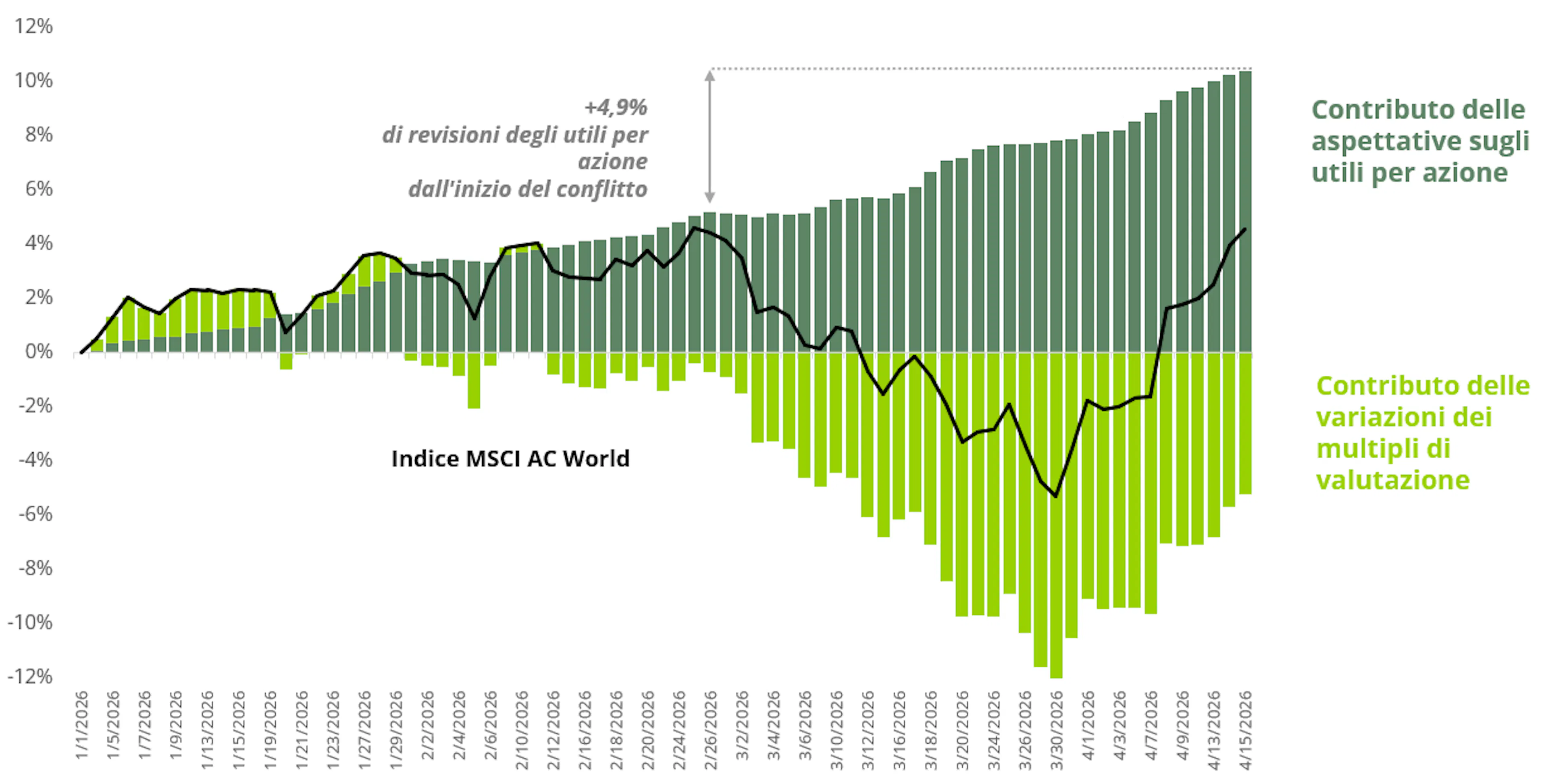 L'analisi dei driver di performance dei principali indici globali chiarisce questo apparente paradosso. I multipli di valutazione non hanno sostenuto i mercati: nel complesso hanno subito una contrazione. I dividendi, dal canto loro, hanno svolto solo un ruolo marginale. È quindi l'effetto dei risultati, ovvero la dinamica degli utili, a spiegare la ripresa dei mercati. Dall'inizio del conflitto iraniano, le previsioni di crescita degli utili per il 2026 sono state riviste al rialzo di oltre il 4%, portandole a circa il +20% su base annua per l'indice azionario globale!1 Questo aspetto spiega la solidità dei mercati nonostante le incertezze. Queste aspettative positive sui risultati contrastano con un contesto più difficile: condizioni finanziarie più restrittive, aumento dei tassi legato a un’inflazione più elevata, rallentamento dell’attività economica, pressioni sui costi e margini già vicini ai massimi storici.