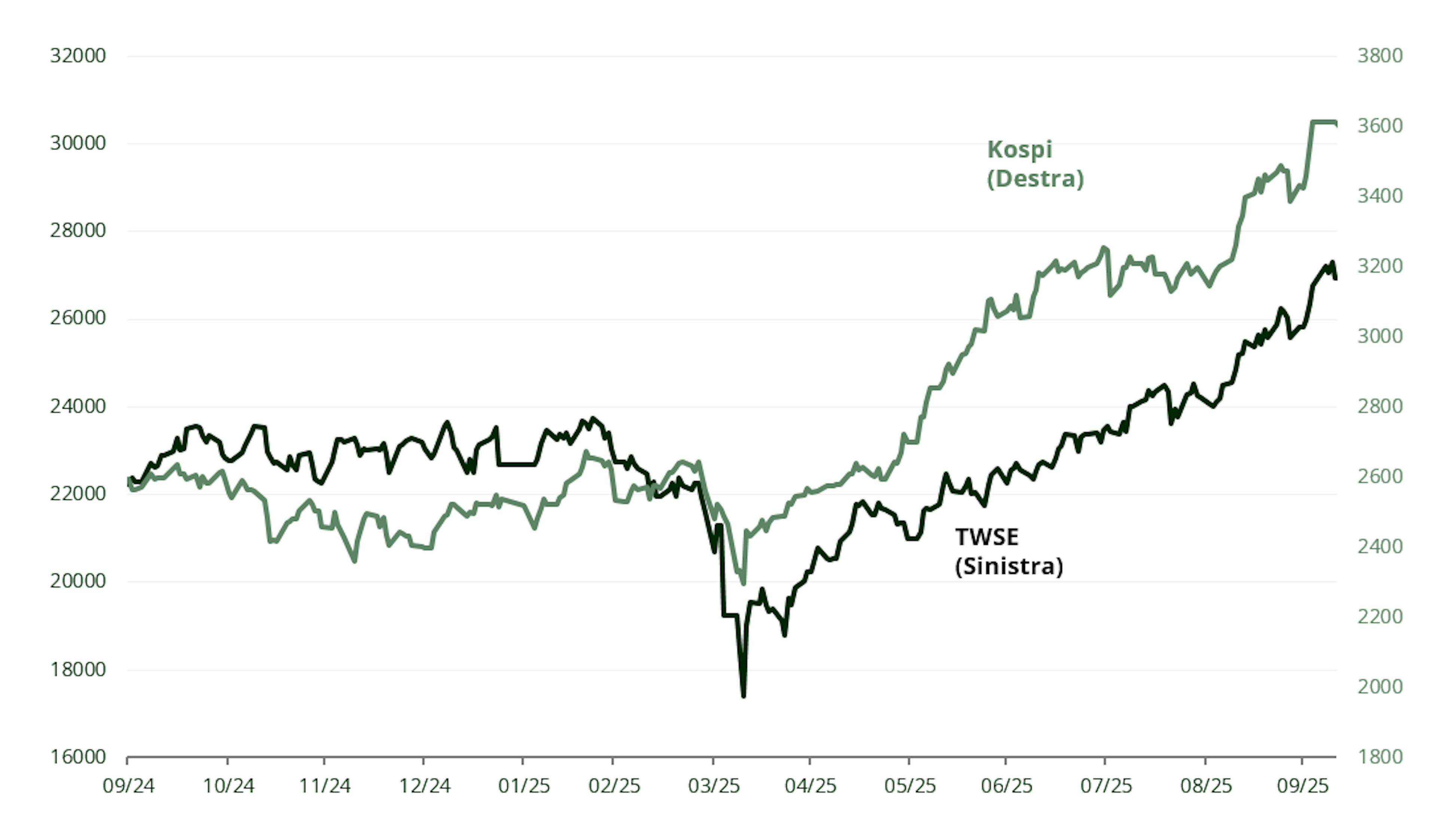 Dalla produzione avanzata di chip a Taiwan agli specialisti di chip di memoria e componenti in Corea del Sud, questi mercati sono indispensabili per l'innovazione globale. Sia l'indice taiwanese sia quello coreano hanno raggiunto nuovi massimi nel 2025, ma gli investitori globali rimangono sottoesposti alla regione: un'inefficienza strutturale che crea opportunità per la gestione attiva.