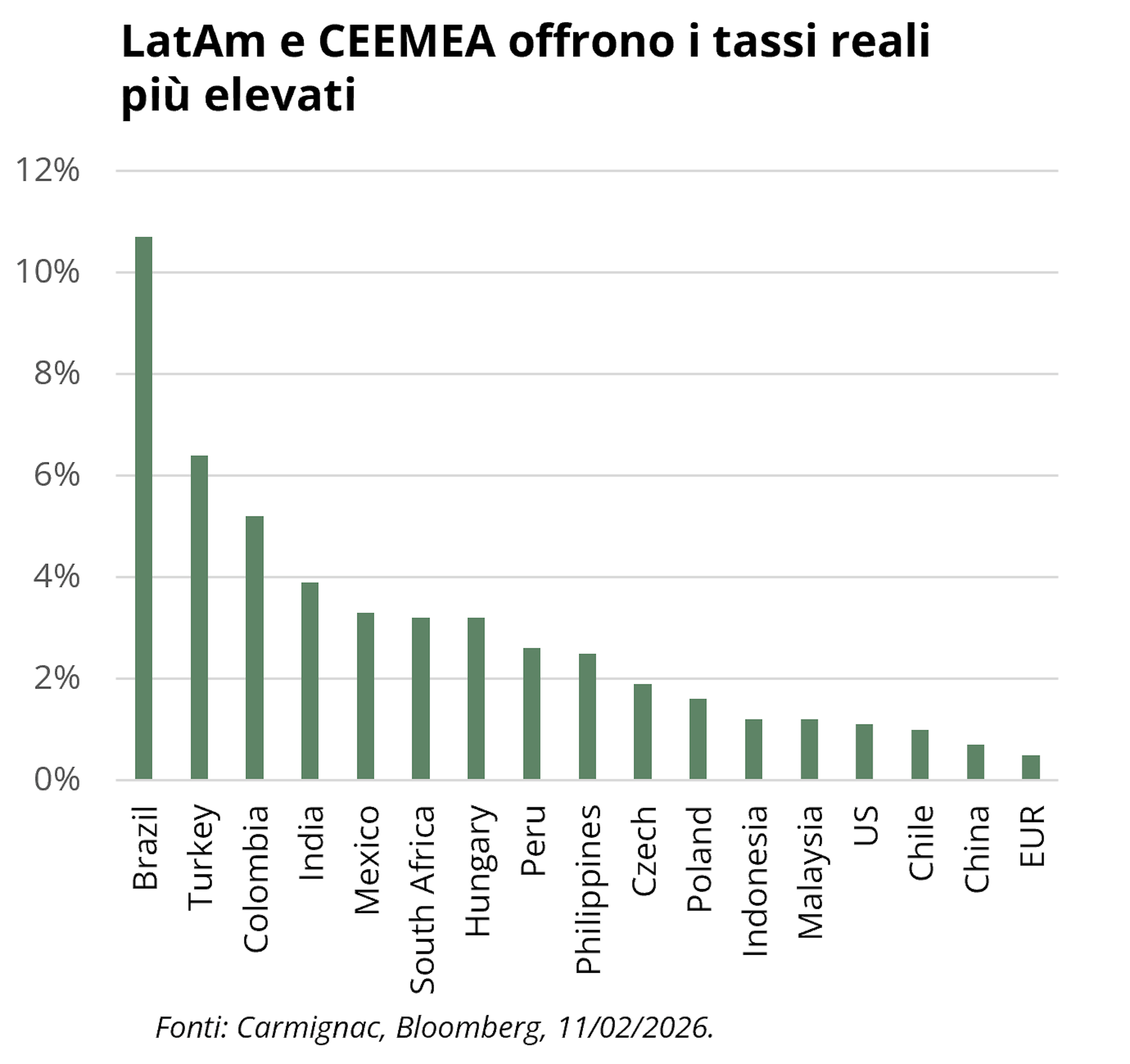 Tuttavia, questo contesto costruttivo non si applica in modo uniforme in tutto l'universo. La selettività è fondamentale. Ci stiamo concentrando sui paesi in cui politiche restrittive, fondamentali in miglioramento e banche centrali credibili creano un chiaro margine per un calo dei tassi.