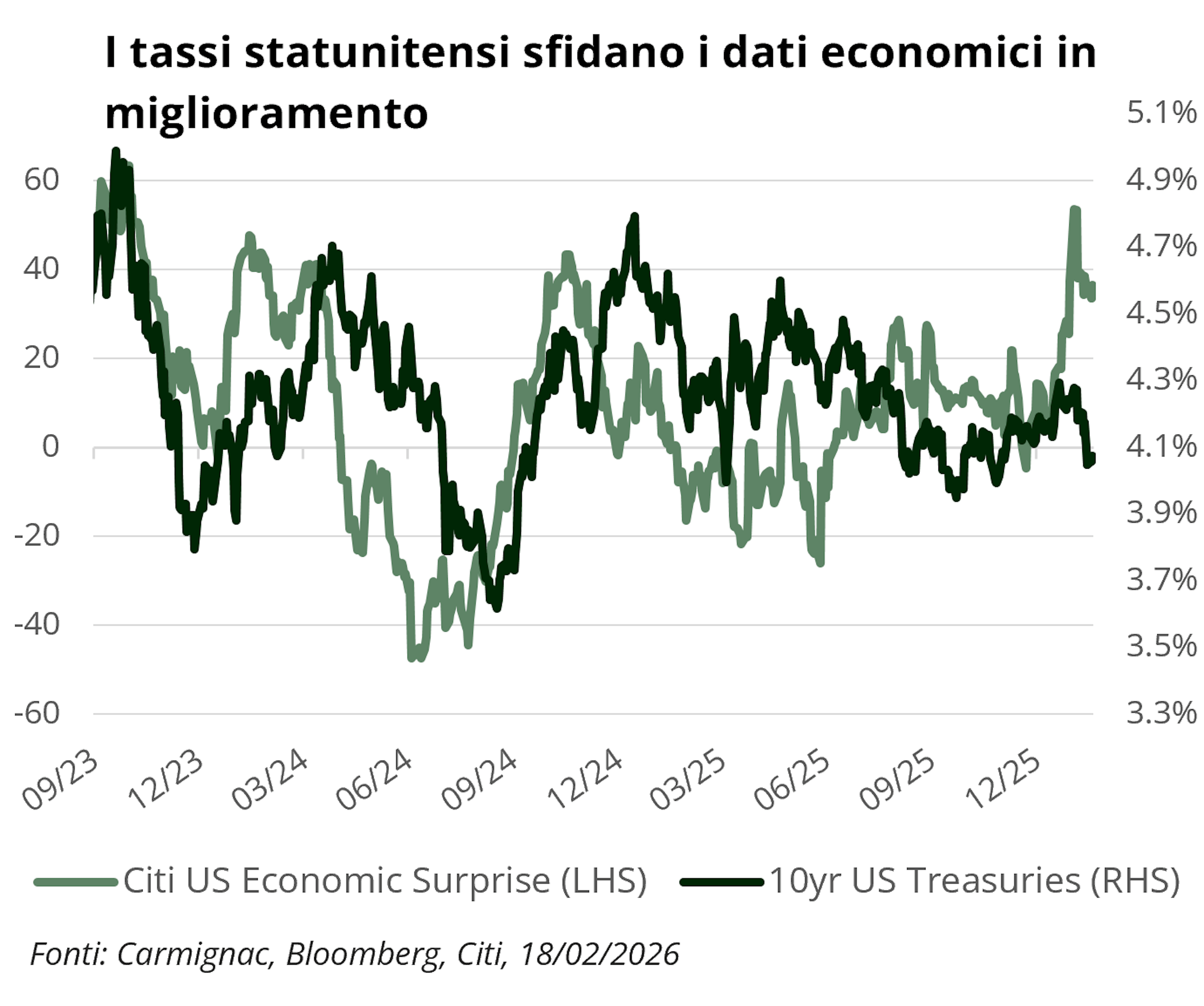 L'economia statunitense continua a dimostrare resilienza. Gli indicatori principali rimangono coerenti con una crescita intorno al 2-2,5% nel 2026, sostenuta dalla spesa in conto capitale guidata dall'intelligenza artificiale e dall'impulso fiscale incorporato nel "One Big Beautiful Bill". Il mercato del lavoro ha subito un rallentamento ma non si è incrinato, con un tasso di disoccupazione che si è stabilizzato intorno al 4%, lontano dai livelli di recessione.