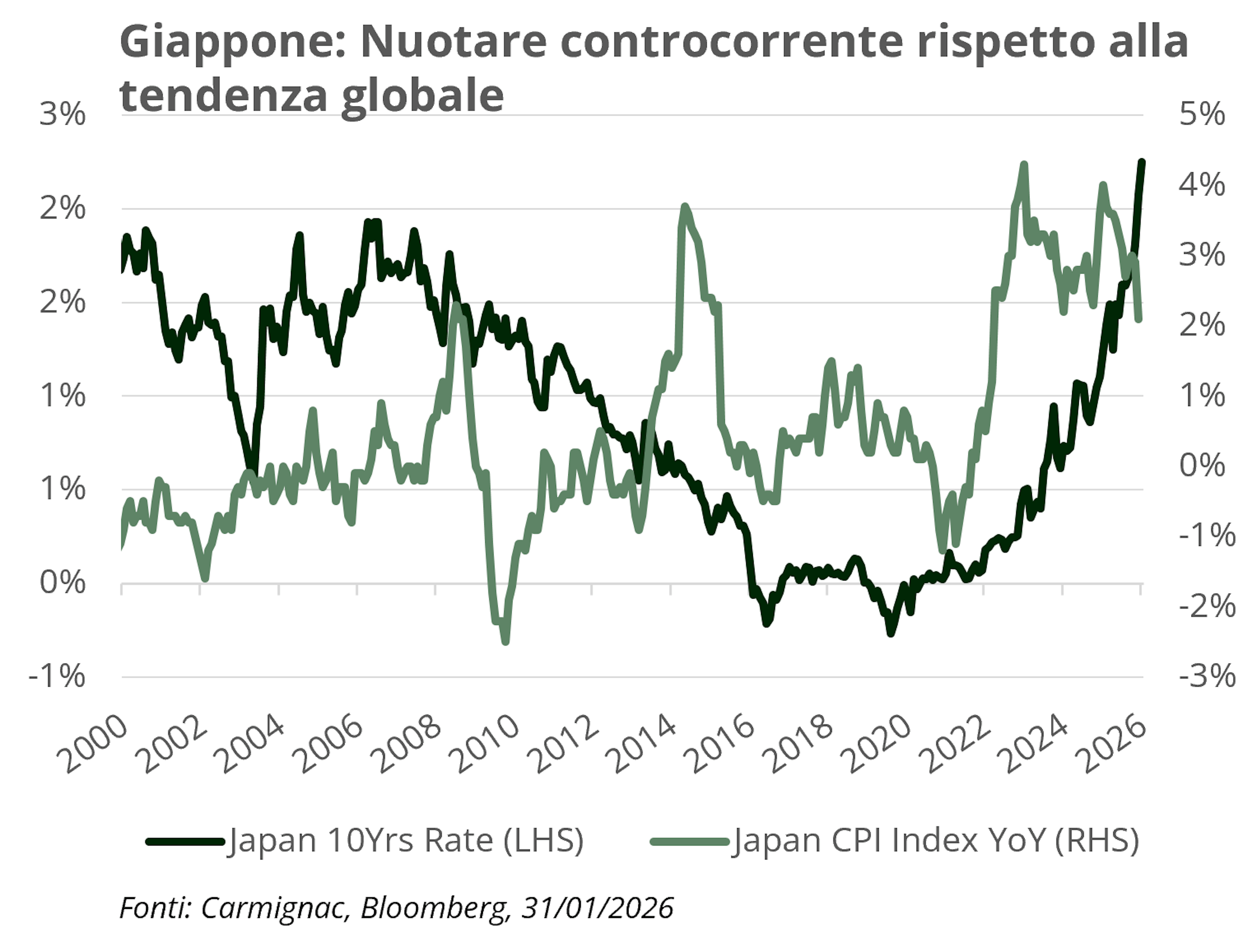 L'elezione decisiva di Sanae Takaichi rafforza questo punto di svolta. Forte di un ampio mandato, la nuova amministrazione sta portando avanti iniziative in materia di politica industriale, sicurezza energetica e difesa, insieme a un rapido pacchetto di stimoli da 1175 miliardi di euro e sgravi fiscali mirati volti ad attenuare l'impatto della persistente inflazione alimentare sulle famiglie. L'attivismo fiscale non è più solo un sostegno anticiclico, ma è diventato strategico. Sebbene il Giappone mantenga la propria capacità fiscale, sostenuta dalla sua posizione di maggiore creditore estero netto al mondo, il regime macrofinanziario sta cambiando.