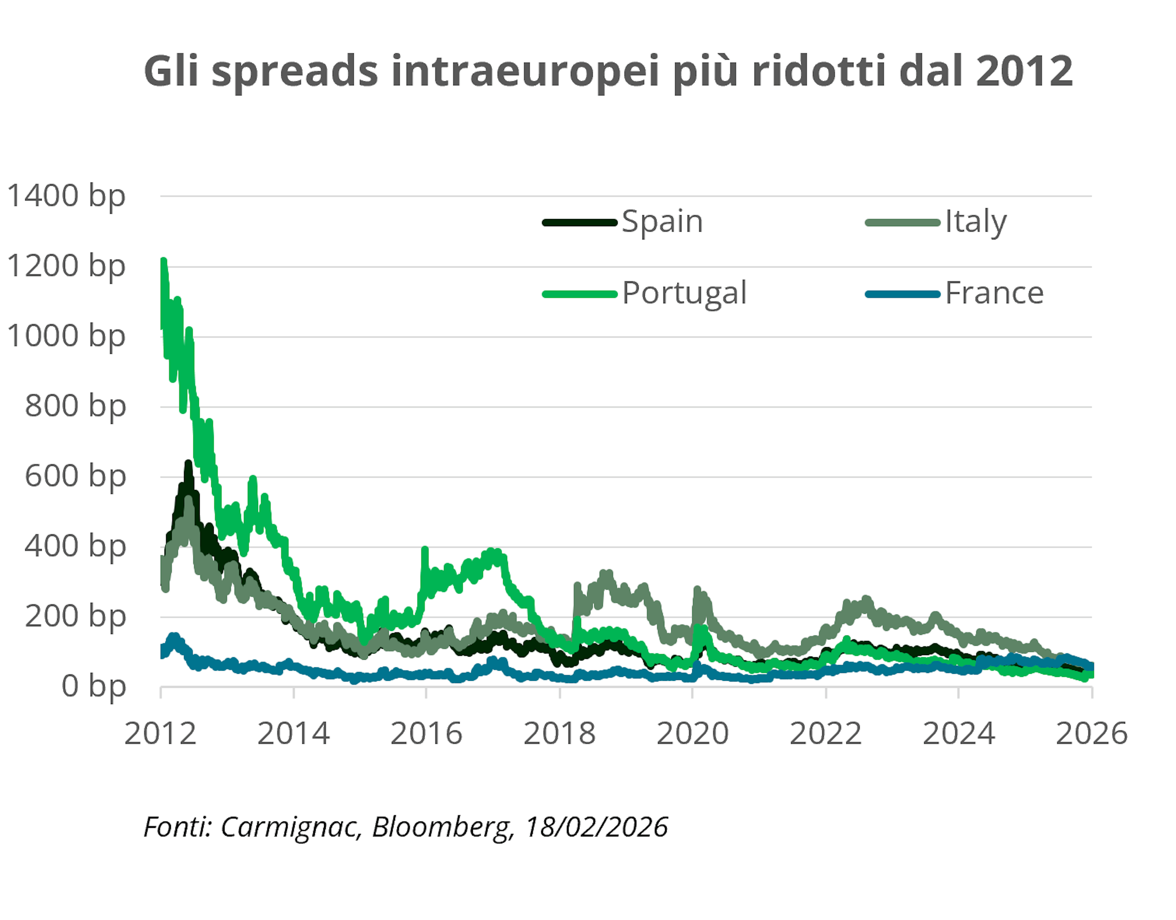 Mentre la Germania rappresenta il pilastro fiscale della ripresa dell'eurozona, il quadro è più sfumato altrove. I fattori alla base della stabilità tedesca: istituzioni credibili, forte capacità fiscale e status di rifugio sicuro, non sono condivisi in modo uniforme in tutta la periferia. Gli spreads rimangono storicamente ridotti, riflettendo un mercato guidato dal carry e dalla ricerca di rendimento. Tuttavia, questo contesto rischia di mascherare le vulnerabilità fiscali e politiche sottostanti in alcuni paesi, tra cui spicca la Francia come esempio significativo.