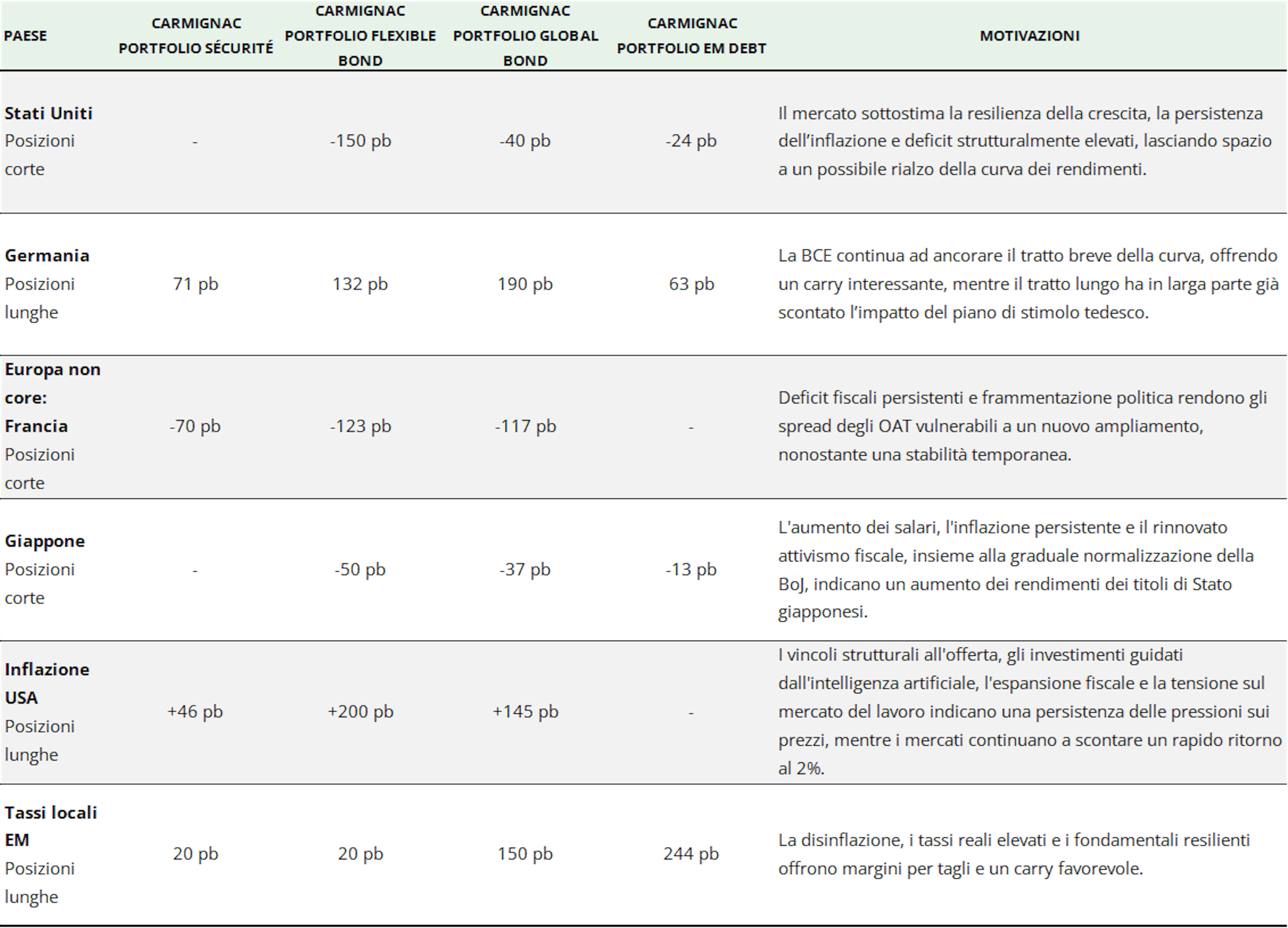 In questo contesto, privilegiamo un'esposizione differenziata in termini di duration: breve su Stati Uniti e Giappone, lunga sulla Germania, cauta sui paesi europei non core e costruttiva su alcuni mercati emergenti selezionati.