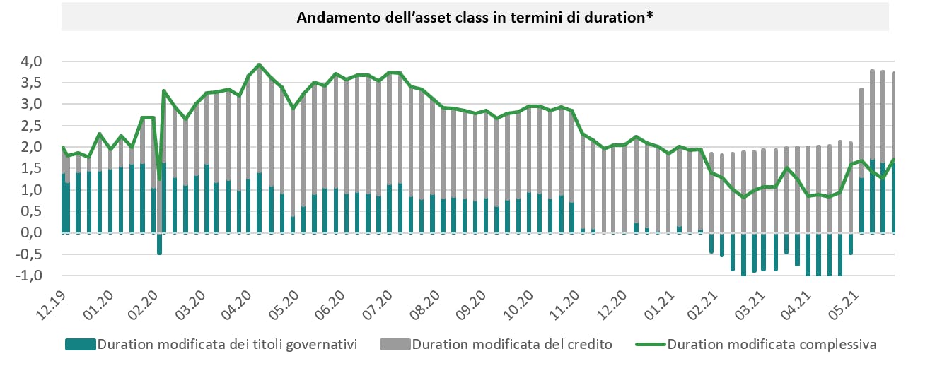 Al contrario, abbiamo mantenuto il nostro posizionamento a breve termine sul mercato obbligazionario di Stati Uniti e Regno Unito, due economie che si trovano in una fase molto più avanzata del ciclo economico rispetto all’Eurozona. Alla fine del trimestre, la duration modificata complessiva del Fondo era pari a circa 2, in rialzo rispetto a 1 alla fine di marzo. L’aumento della duration modificata ci ha consentito di attutire l’impatto derivante dall’inversione di tendenza dei rendimenti, registratasi durante il periodo.