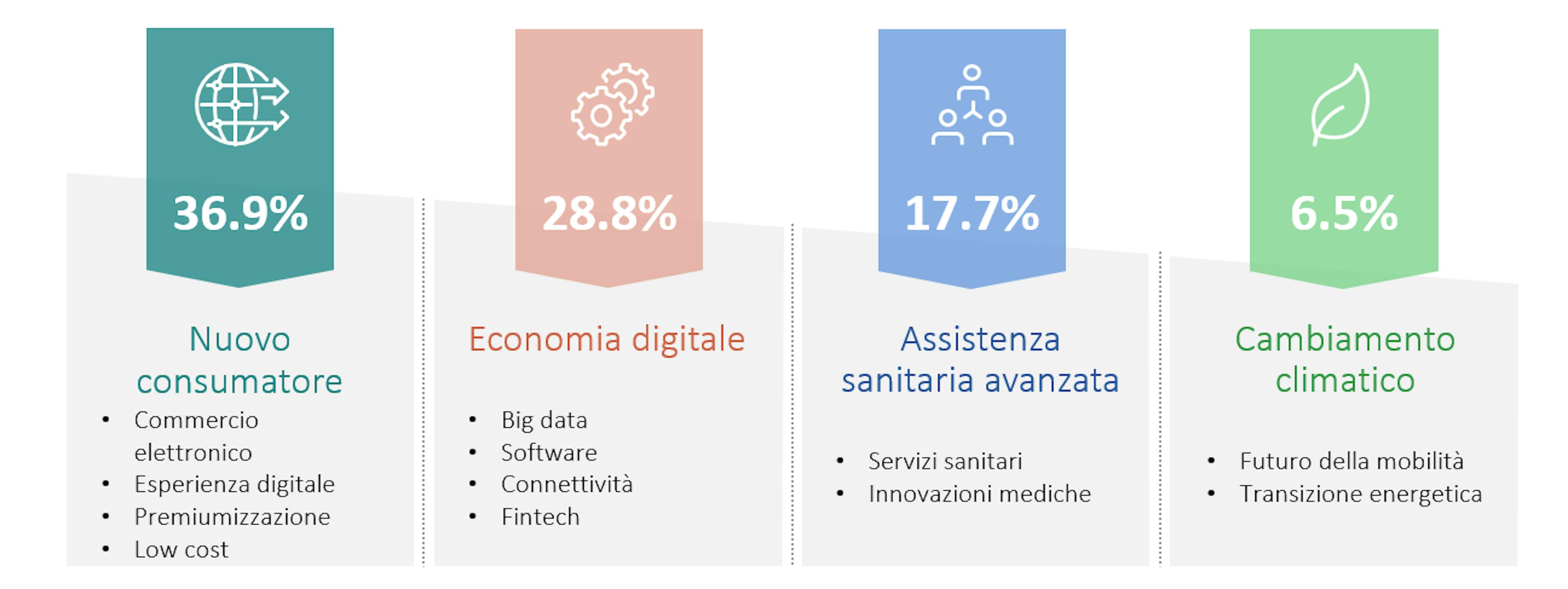 Nel complesso, manteniamo un portafoglio liquido e solido di investimenti di forte convinzione, diversificato in termini di aree geografiche, settori e tematiche. Le nostre principali tematiche ruotano attorno a: