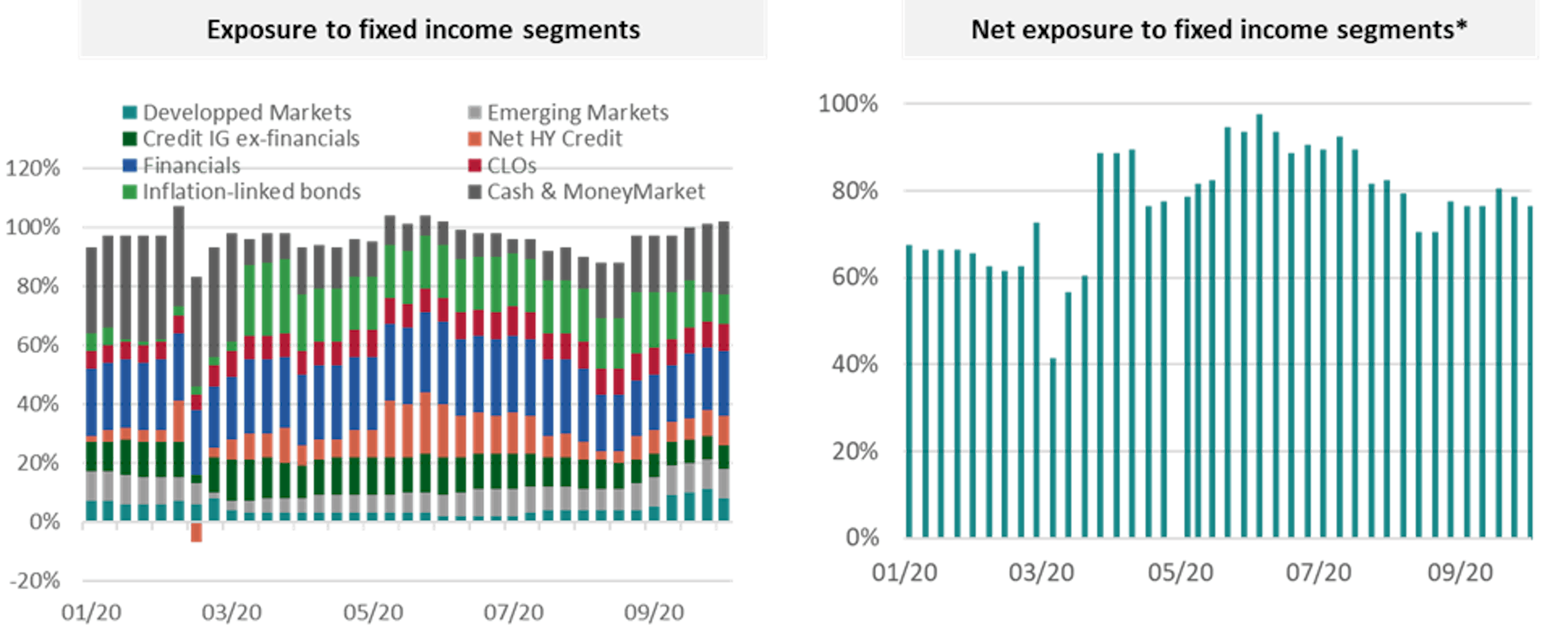 The effects of the economic downturn have been offset by stimulus policies introduced around the world, leading us to invest heavily during the second quarter in various parts of the credit space. By early July, corporate credit accounted for 64% of our fixed-income allocation. With central banks engaged in an increasingly pronounced economic support drive, we took inflation-linked bonds to 19% of our portfolio at the start of July to benefit from rising inflation expectations and falling real interest rates. We thus entered the third quarter with 91% exposure to the fixed-income market and negligible cash holdings – a sign of the many opportunities the market had to offer at that point.