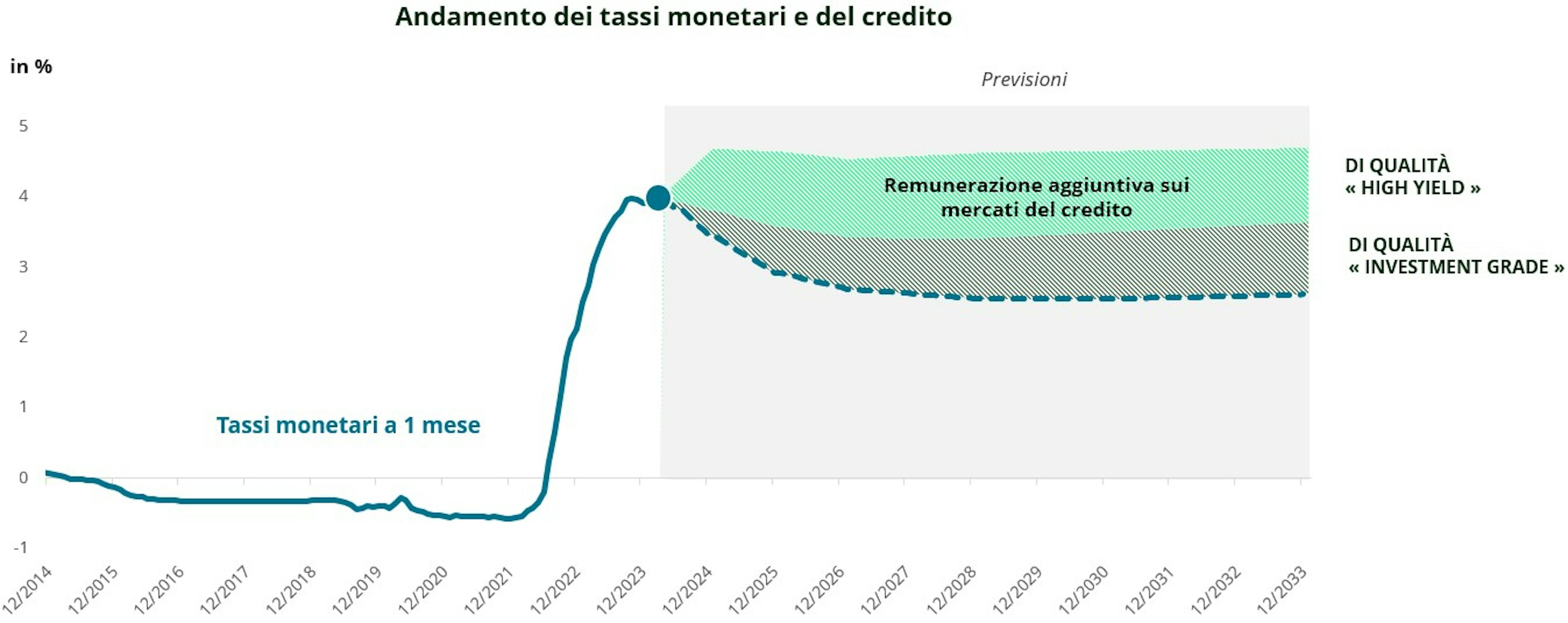 È importante garantire già oggi rendimenti interessanti in prospettiva futura. I mercati del credito offrono rendimenti aggiuntivi di cui un investitore può godere per i prossimi trimestri, o addirittura anni. L’area verde tratteggiata nel grafico corrisponde alla remunerazione aggiuntiva offerta attualmente dai mercati del credito rispetto al tasso monetario. In altre parole, si tratta del “mancato guadagno”, compreso tra l’1% e il 2% annuo, in cui incorrerebbe qualsiasi investitore che decidesse di mantenere le proprie posizioni sui mercati monetari o che dovesse tardare a riallocare il proprio capitale, e questa mancata performance è tutt’altro che trascurabile.