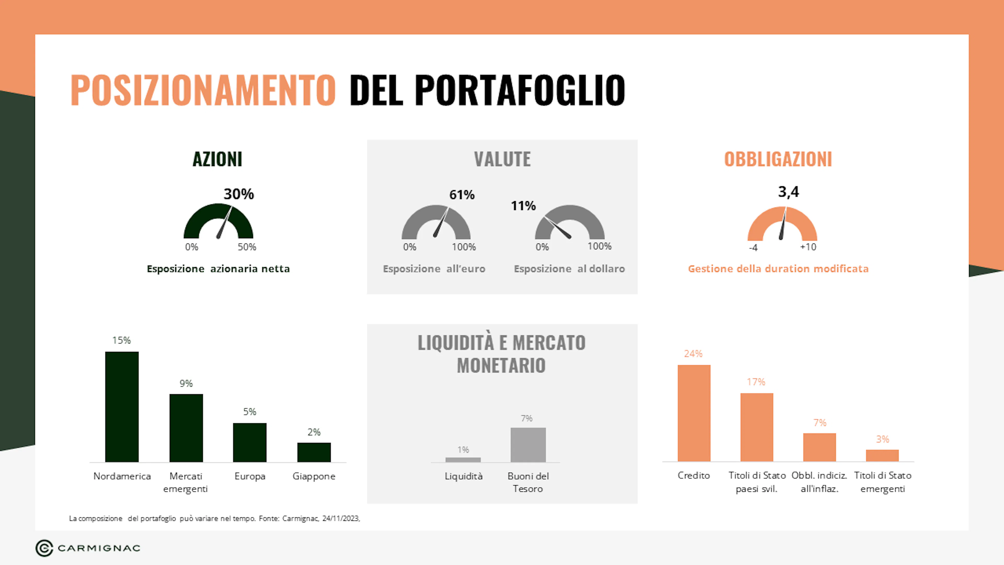 Il presente documento non può essere riprodotto, totalmente o parzialmente, senza la previa autorizzazione della Società di gestione. Il presente documento non costituisce né un’offerta di sottoscrizione né una consulenza di investimento. Esso non intende fornire consulenza fiscale, giuridica o contabile e non deve essere utilizzato in tal senso. Il presente documento viene fornito unicamente a scopo informativo e non deve essere utilizzato per valutare la convenienza di un investimento in titoli o partecipazioni in esso illustrati né per qualsivoglia altra finalità. Le informazioni contenute nel presente documento possono essere parziali e possono essere modificate senza preavviso. Esse sono aggiornate alle data di redazione del presente documento e sono tratte da fonti proprietarie e non proprietarie ritenute affidabili da Carmignac. Non sono necessariamente esaustive o accurate. Di conseguenza, Carmignac, i suoi dirigenti, dipendenti o agenti non ne garantiscono l’accuratezza o l’affidabilità e declinano ogni responsabilità in caso di errori e omissioni (compresa la responsabilità verso terzi in caso di negligenza).