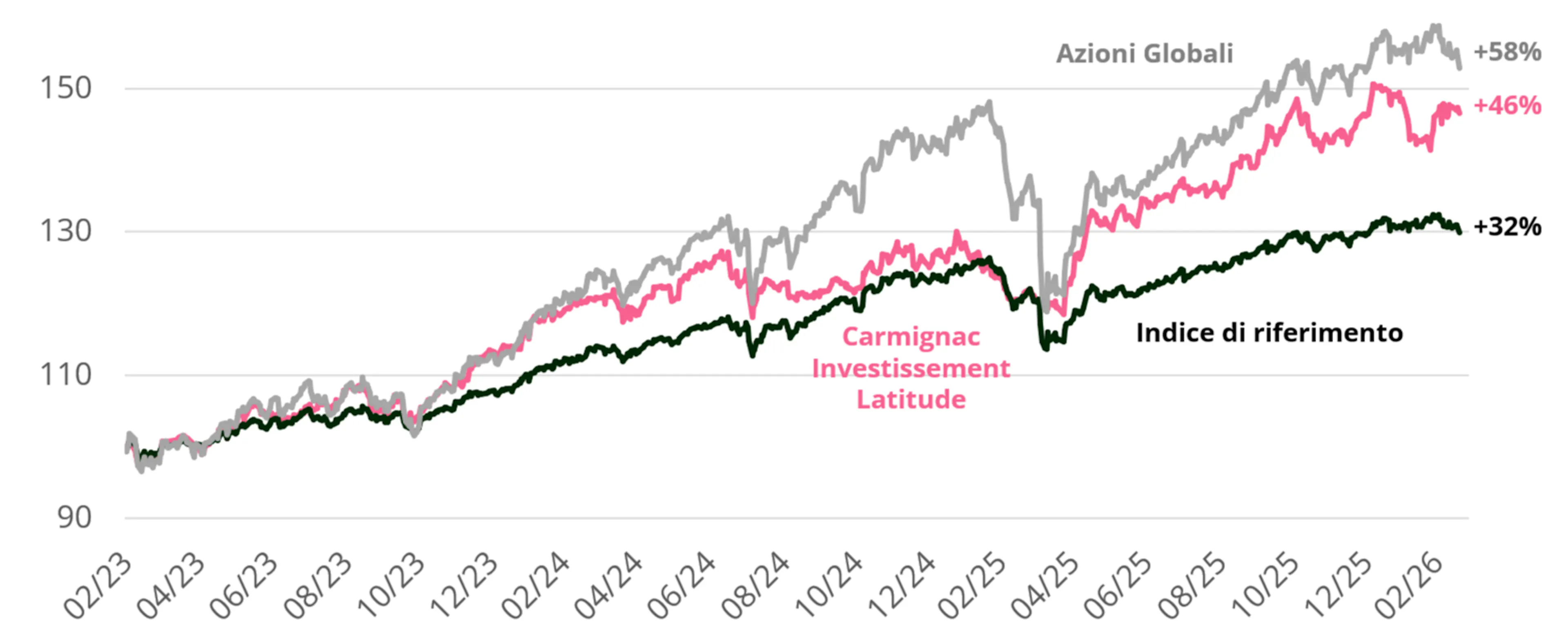 Con l’escalation del conflitto in Iran, la strategia si trova nuovamente a dover affrontare un contesto di mercato complesso. In questo scenario, l'efficacia della selezione dei titoli, combinata con un'esposizione media di circa il 33%4, ha finora contribuito a contenere il ribasso, dimostrando ancora una volta la capacità della strategia di mitigare le fasi di correzione.