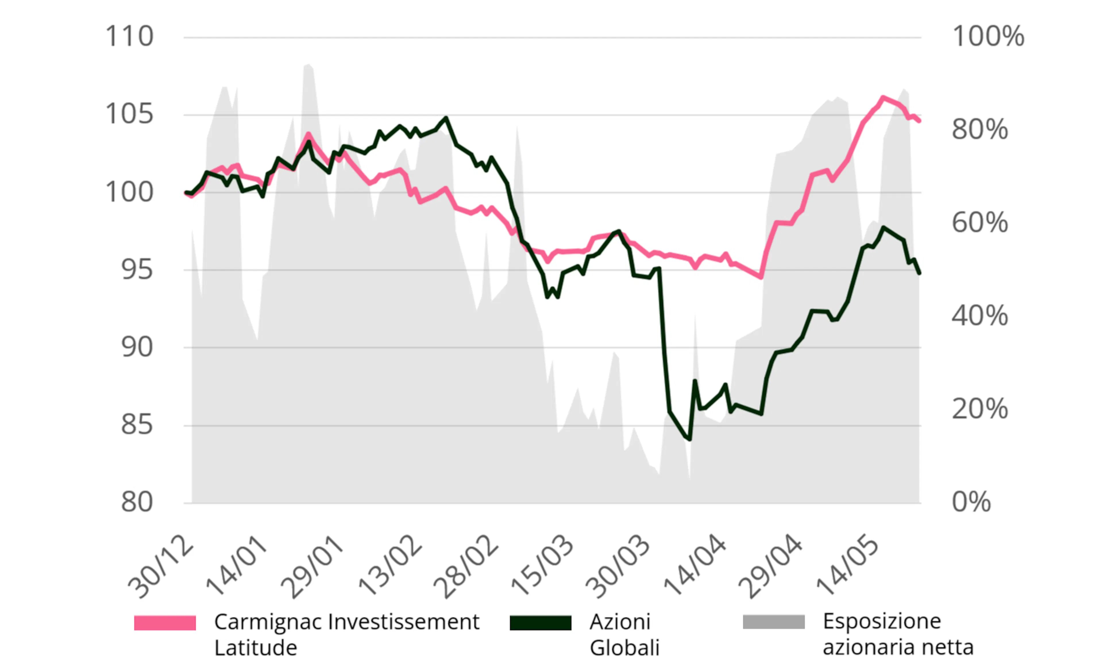 Questa sequenza illustra pienamente la filosofia di Carmignac Investissement Latitude: ridurre l'esposizione nei periodi di tensione e riposizionarsi rapidamente non appena le condizioni migliorano.
