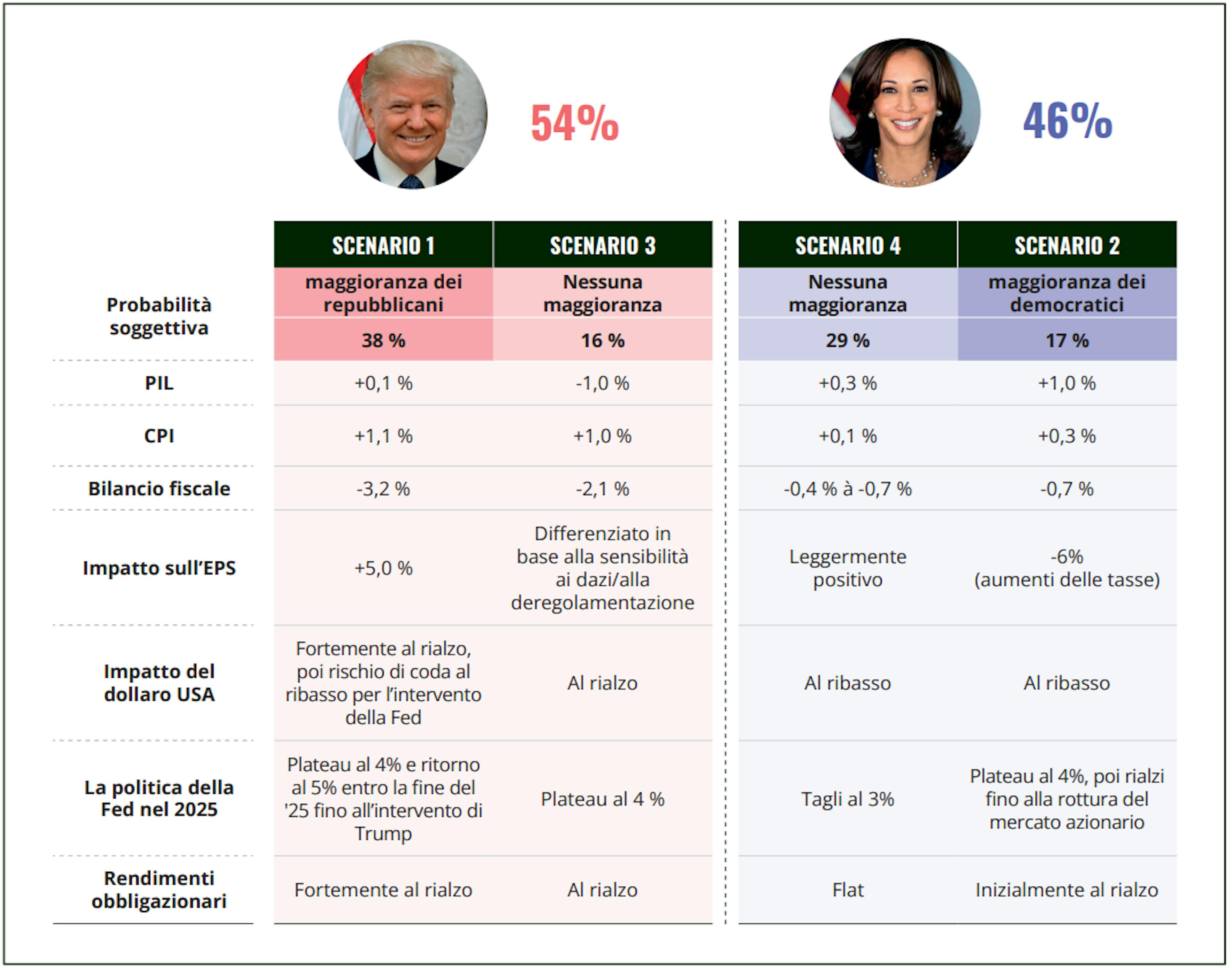 Chiaramente, una maggioranza repubblicana (con la conquista sia della presidenza che del Congresso) sarebbe l’esito di maggiore impatto dal punto di vista degli investimenti sostenibili. Un’amministrazione Trump cercherebbe di smantellare un’”architettura pro-ESG” per rafforzare la “vecchia economia” in un momento di significativi cambiamenti globali.